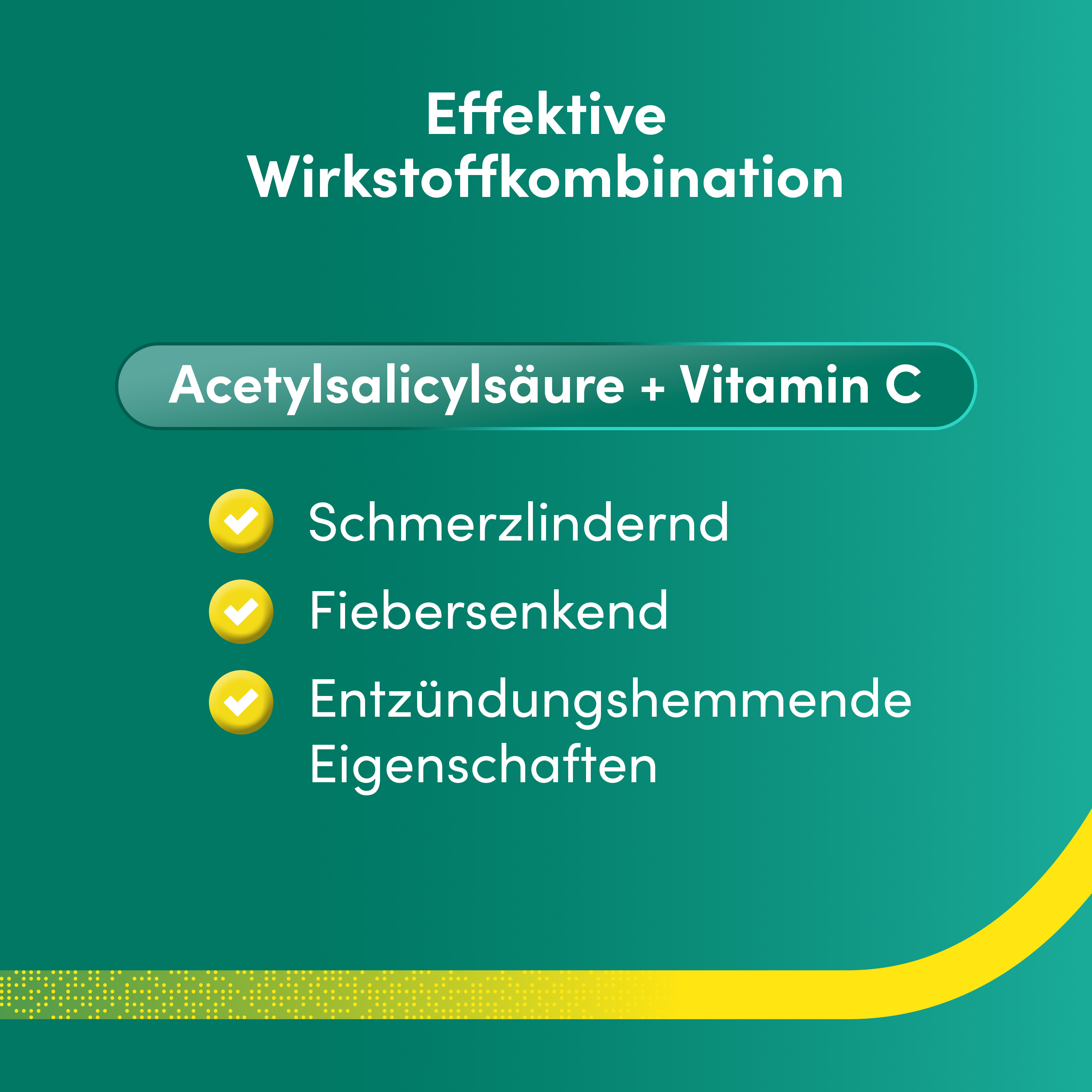 - Die Wirkstoffkombination aus Acetylsalicylsäure und Vitamin C wirkt effektiv gegen erste Erkältungsanzeichen wie Kopf-, Hals- und Gliederschmerzen und Fieber