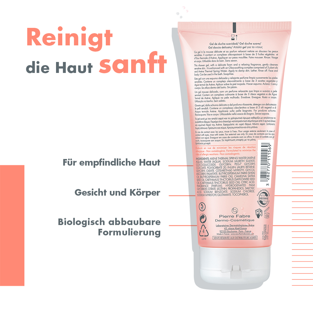 AVENE THERMAL SPRING WATER (AVENE AQUA), WATER (AQUA), SODIUM LAURETH SULFATE, COCO-GLUCOSIDE, GLYCERIN, PEG-7 GLYCERYL COCOATE, POLYSORBATE 20, INULIN, LAURYL BETAINE, GLYCERYL OLEATE, CETEARETH-60 MYRISTYL GLYCOL, ASCORBYL PALMITATE, BUTYROSPERMUM PARKII (SHEA) OIL (BUTYROSPERMUM PARKII OIL), CAMELINA SATIVA SEED OIL, CARTHAMUS TINCTORIUS (SAFFLOWER) SEED OIL (CARTHAMUS TINCTORIUS SEED OIL), CITRIC ACID, FRAGRANCE (PARFUM), HYDROGENATED PALM GLYCERIDES CITRATE, LECITHIN, PROPANEDIOL, SALICYLIC ACID, SODIUM BENZOATE, SODIUM CHLORIDE, SODIUM MYRISTOYL GLUTAMATE, TOCOPHEROL