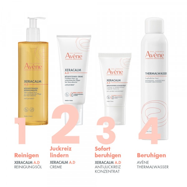 Die Wirkung von XeraCalm A.D beruht auf einer einzigartigen Aktivstoff-Kombination. Grundlage ist das bewährte Avène Thermalwasser mit seinen hautberuhigenden, reizlindernden und entzündungshemmenden Eigenschaften. Ein CER-OMEGA-Lipidkomplex mit ungesättigten Omega-6-Fettsäuren stärkt die Hautbarriere, nährt die Haut und fördert ihre Regeneration. Das Herzstück von XeraCalm A.D ist der innovative Aktivstoff I-modulia®, der in intensiver wissenschaftlicher Forschung aus der Mikroflora des Avène Thermalwassers (Aquaphilus dolomiae) entwickelt wurde. Er lindert den durch Trockenheit verursachten Juckreiz, beruhigt Rötungen und stimuliert die Immunabwehr der Haut, um bakteriellen Superinfektionen entgegenzuwirken.
