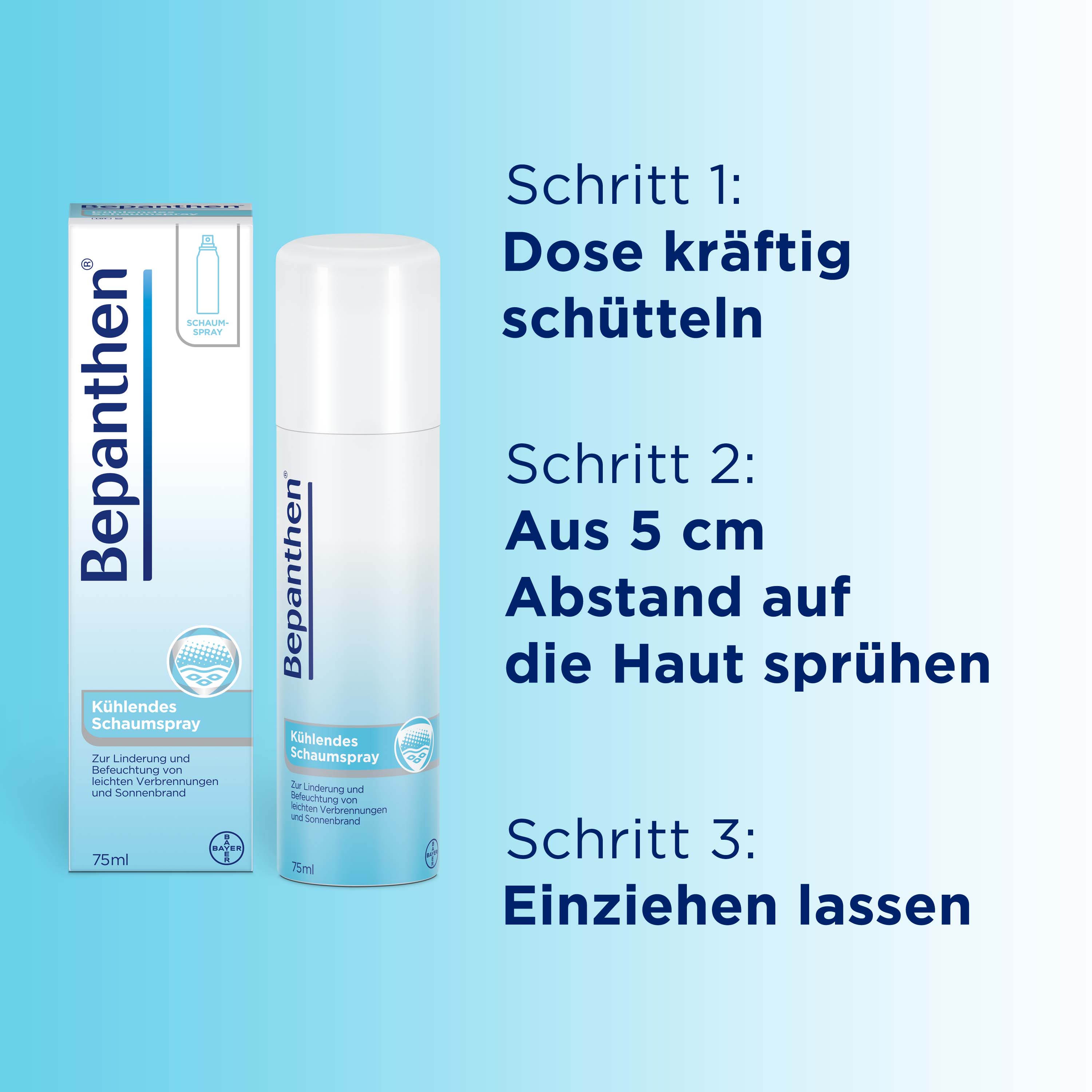 Bepanthen® Kühlendes Schaumspray wurde speziell für leichte Verbrennungen entwickelt: Es erzeugt einen dünnen, leichten Schaumfilm auf der geröteten Haut, der von selbst einzieht und angenehm kühlend wirkt. Dies hat einen wohltuenden und lindernden Effekt. Bepanthen® Kühlendes Schaumspray versorgt die Haut zudem nachhaltig mit Feuchtigkeit und fördert so den natürlichen Heilungsprozess.