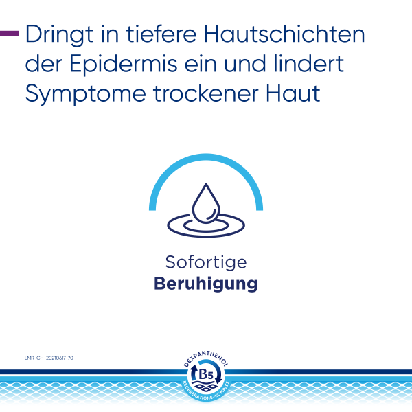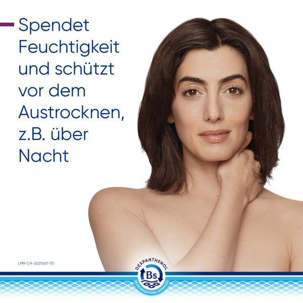 Der B5-Regenerations-Komplex unterstützt die Regeneration der Haut – von innen nach außen. Dabei fördert Dexpanthenol in tieferen Hautschichten der Epidermis die natürliche Zellregeneration. Das enthaltene Glycerin spendet sofortige und lang anhaltende Feuchtigkeit. Niacinamid (Vitamin B3) beruhigt juckende, trockene Haut und natürliche Lipide wie Sheabutter und Arganöl ergänzen fehlende Hautlipide. Das physiologische Lipid unterstützt zusätzlich die Anordnung der Doppellipidschicht.