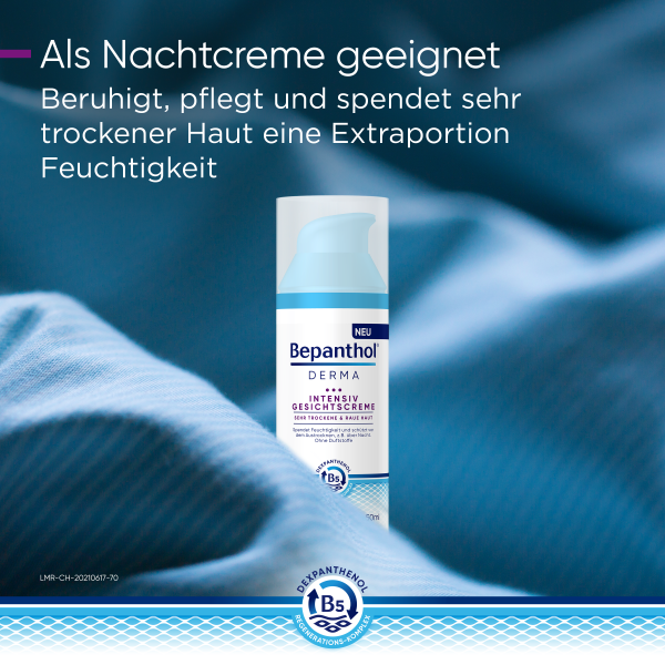 Die reichhaltige, nicht fettende Formulierung der Bepanthol® DERMA Intensiv Gesichtscreme pflegt intensiv und zieht schnell ein. Sie spendet Feuchtigkeit und schützt vor dem Austrocknen, z. B. über Nacht – für zarte und geschmeidige Haut. Die Gesichtscreme ist besonders für raue und sehr trockene Haut geeignet. Sie wirkt sofort beruhigend und lindert Spannungsgefühle.
