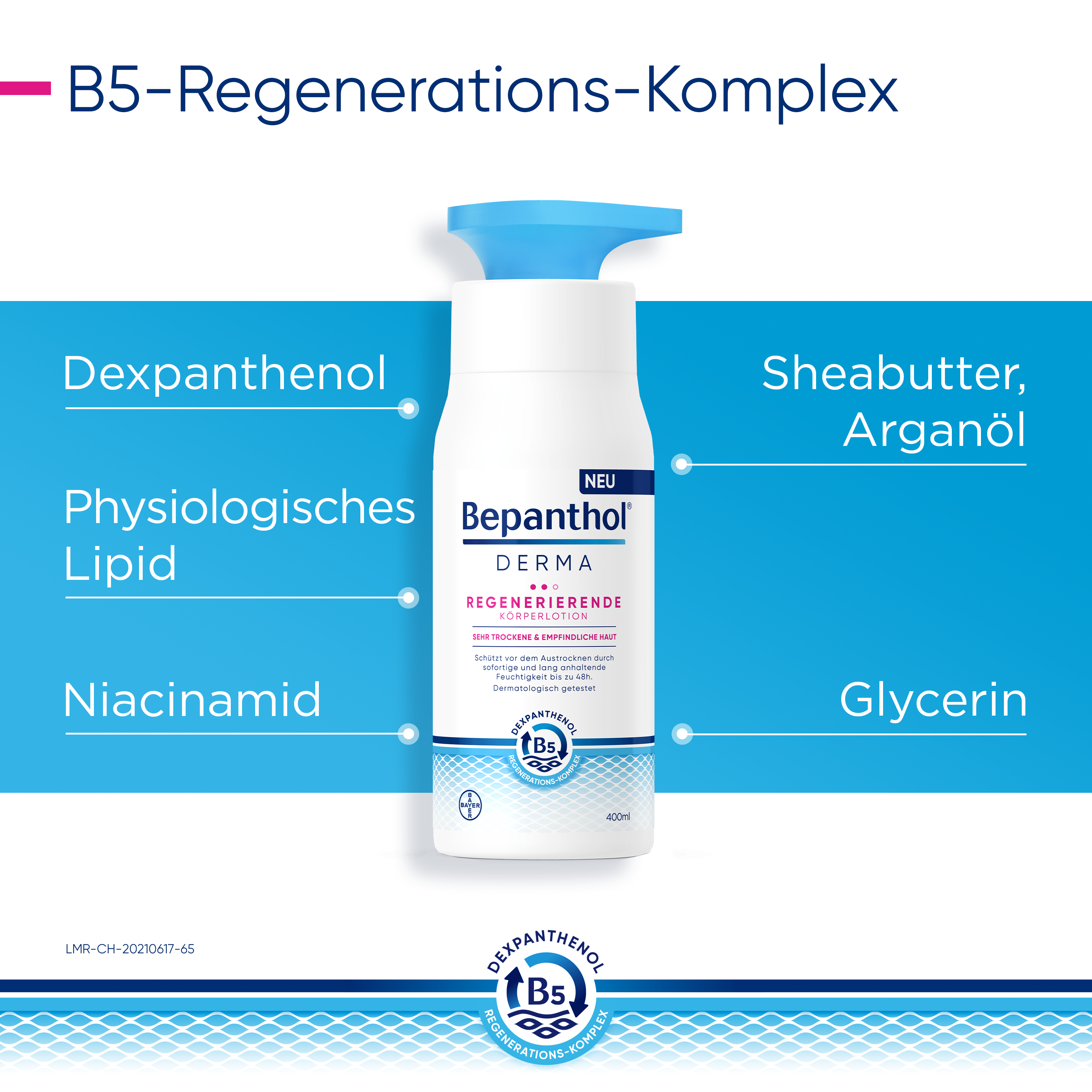 Der B5-Regenerations-Komplex unterstützt die Regeneration der Haut – von innen nach außen. Dabei fördert Dexpanthenol in tieferen Hautschichten der Epidermis die natürliche Zellregeneration. Das enthaltene Glycerin spendet sofortige und lang anhaltende Feuchtigkeit. Niacinamid (Vitamin B3) beruhigt juckende, trockene Haut und natürliche Lipide wie Sheabutter und Arganöl ergänzen fehlende Hautlipide. Das physiologische Lipid unterstützt zusätzlich die Anordnung der Doppellipidschicht.