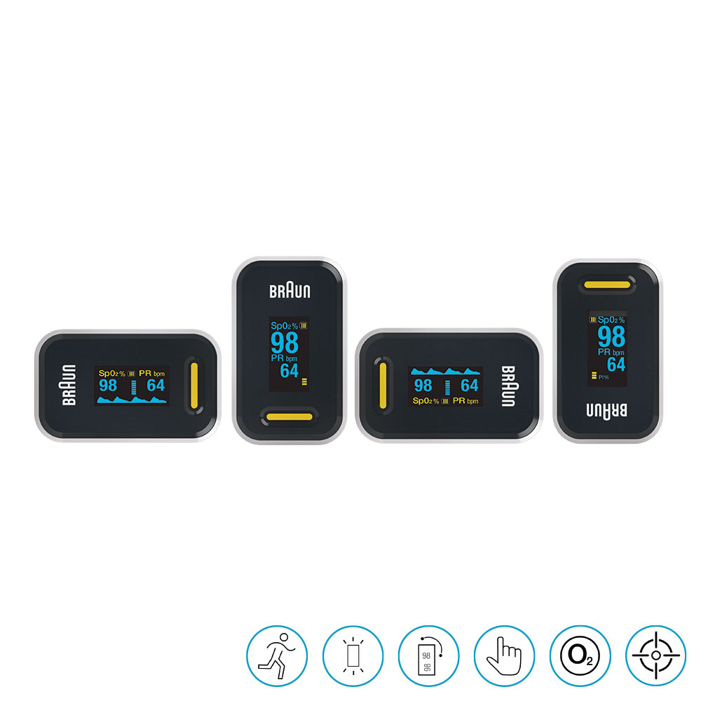 Atemwegserkrankung gehen meist mit einer verminderten Lungenfunktion einher, was zu einem niedrigeren Sauerstoffgehalt im Blut führen kann. Wenn es für Sie wichtig ist, den Blutsauerstoffgehalt zu messen, ist das Braun Pulsoximeter 1 praktisch, klar und bequem. Messen Sie mit dem einfachen Finger-Clip mühelos und genau. Die Ergebnisse können sofort auf dem rotierenden OLED-Display mit Hintergrundbeleuchtung abgelesen werden. Mit dem praktischen Band können Sie es immer dabei haben.