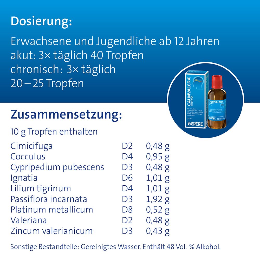 Calmvalera Tropfen Die Anwendungsgebiete leiten sich von den homöopathischen Arzneimittelbildern ab. Dazu gehören: Nervöse Störungen wie Schlafstörungen und Unruhe, Verstimmungszustände. Enthält 48 Vol.-% Alkohol. Zu Risiken und Nebenwirkungen lesen Sie die Packungsbeilage und fragen Sie Ihren Arzt oder Apotheker.