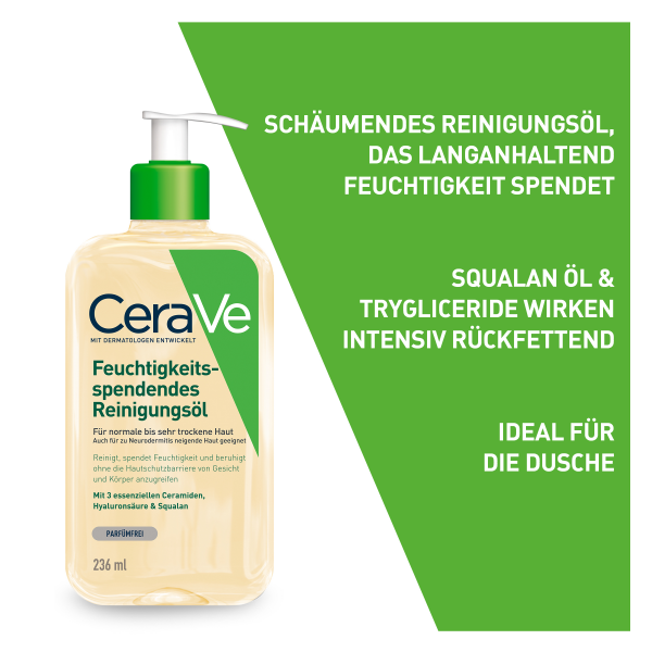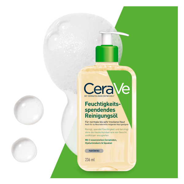 - Das Reinigungsöl von CeraVe verzichtet auf Duftstoffe und Seife und eignet sich somit auch für Babyhaut sowie bei Neurodermitis und Allergien.