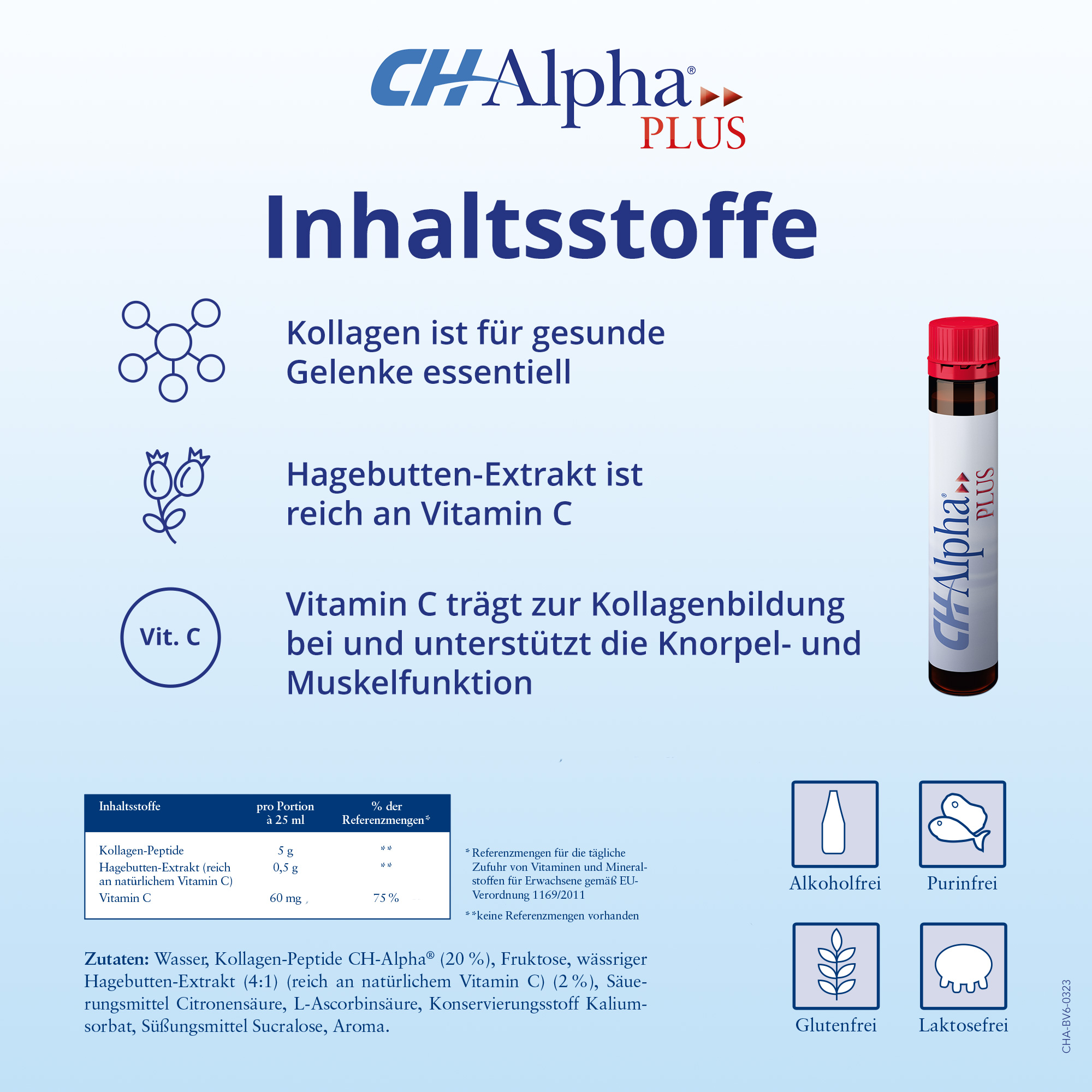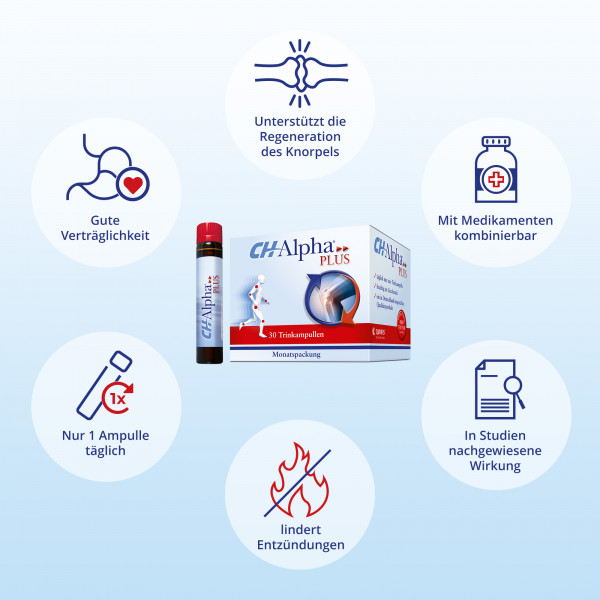 • GEZIELTE VERSORGUNG DER GELENKKNORPEL: Die speziellen Kollagen-Peptide in CH-Alpha® PLUS wirken gezielt in den Kollagenstrukturen der Gelenke und Bandscheiben und können besonders gut vom Körper aufgenommen werden.