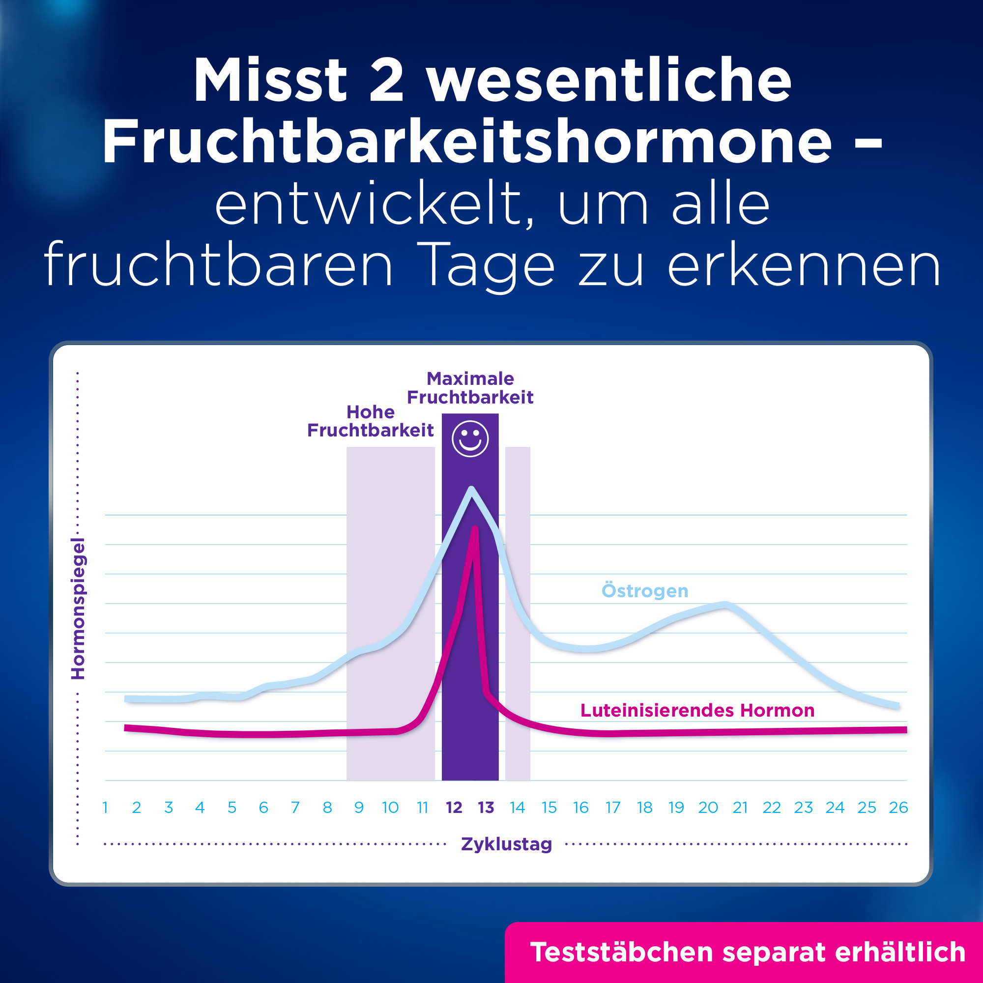 • Misst 2 wichtige Fruchtbarkeitshormone – entwickelt, um alle fruchtbaren Tage zu erkennen