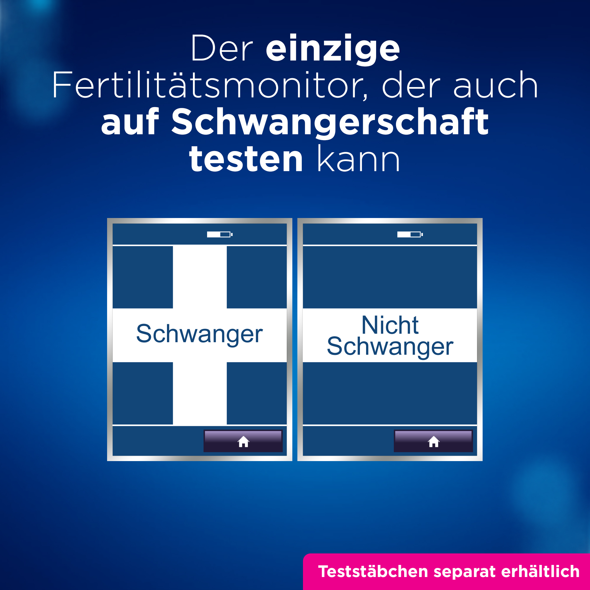 Teststäbchen sind in dieser Packung NICHT enthalten. Diese Packung enthält 1 Clearblue Fertilitätsmonitor Advanced, der nur mit Clearblue Fertilitätsmonitor Advanced Fruchtbarkeitsteststäbchen und Clearblue Fertilitätsmonitor Advanced Schwangerschaftsteststäbchen verwendet werden kann – alle separat in der Clearblue Fertilitätsmonitor Advanced Teststäbchen-Nachfüllpackung erhältlich: 30 Fruchtbarkeitstests für den Eisprung & 3 Schwangerschaftstests.