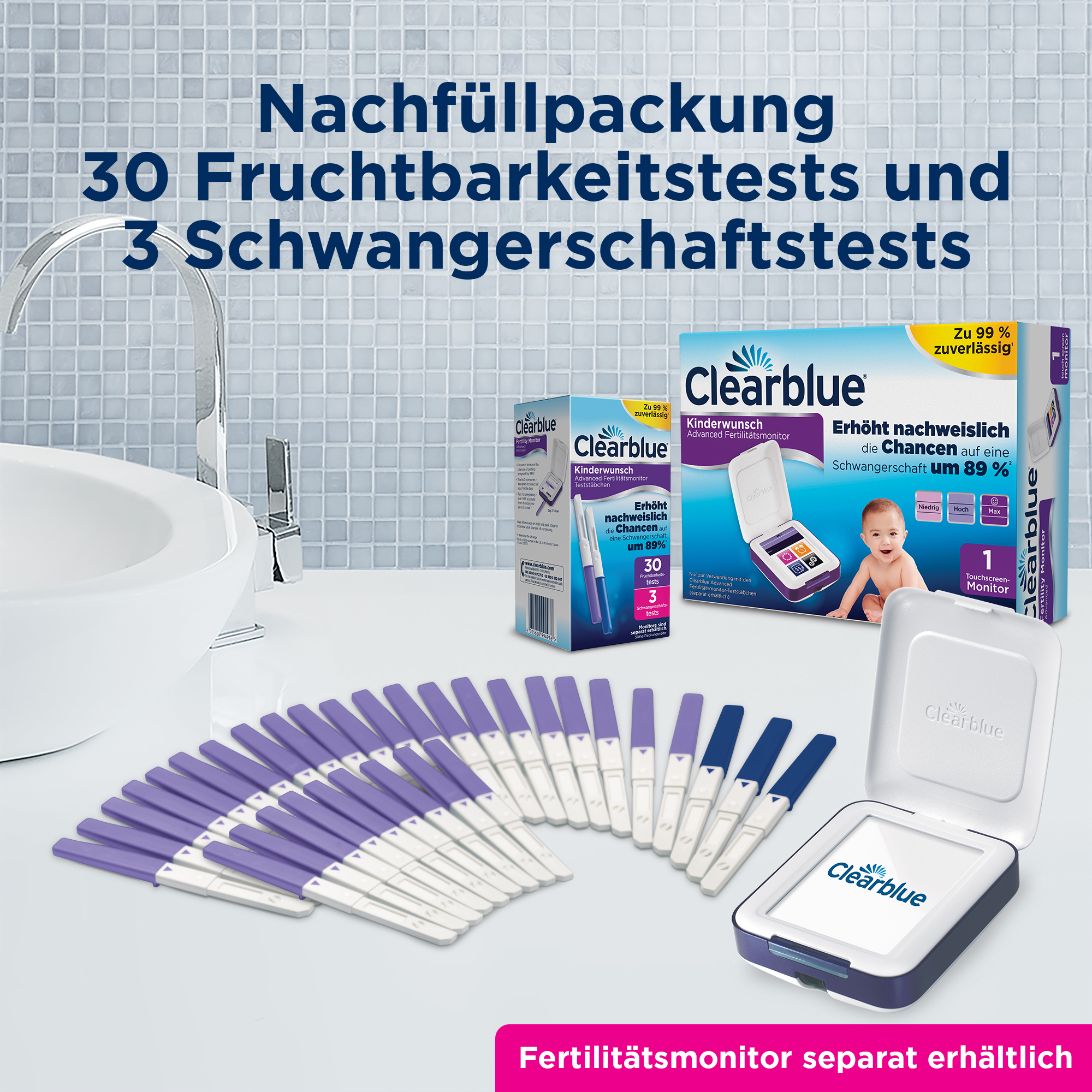 Die Teststäbchen-Nachfüllpackung für den Clearblue Fertilitätsmonitor Advanced enthält 30 Fruchtbarkeitstests und 3 Schwangerschaftstests, die einzeln verpackt sind. Der Clearblue Fertilitätsmonitor Advanced ist NICHT in diesem Paket enthalten. Die Fruchtbarkeitsteststäbchen aus dieser Packung können nur mit dem Clearblue Fertilitätsmonitor Advanced (separat erhältlich) oder dem Clearblue Fertilitätsmonitor verwendet werden; sie funktionieren nicht mit unseren anderen Clearblue Ovulationstests. Die Schwangerschaftsteststäbchen aus dieser Packung können nur mit dem Clearblue Fertilitätsmonitor Advanced (separat erhältlich) verwendet werden.