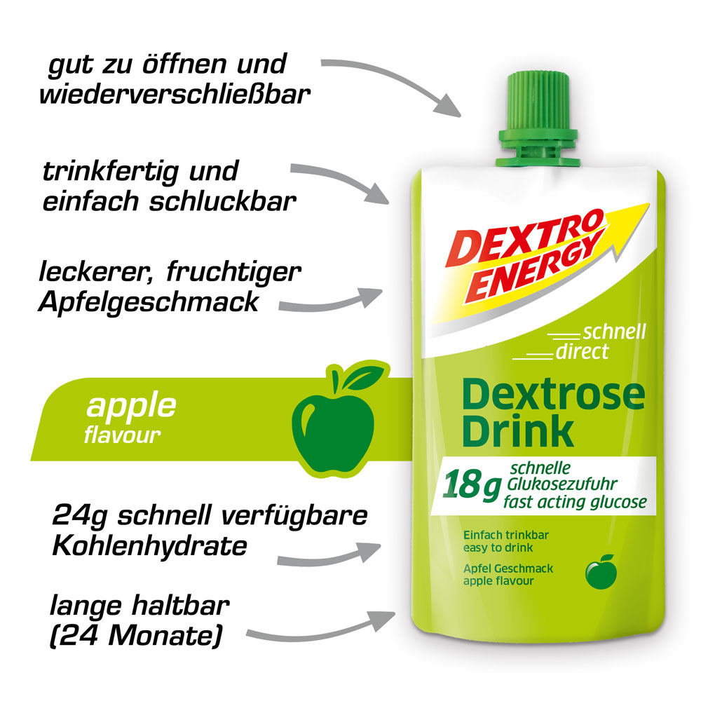 Für Diabetiker: Die flüssige Alternative zu den bekannten Dextrosetäfelchen – 50ml enthalten 18g schnell verfügbare Glukose und stellen insgesamt 24g Kohlenhydrate bereit. Ideal in Situationen der Unterzuckerung. Trinkfertig liefert der Dextrose Drink schnell verfügbare Kohlenhydrate. Mit fruchtigem Apfelgeschmack.