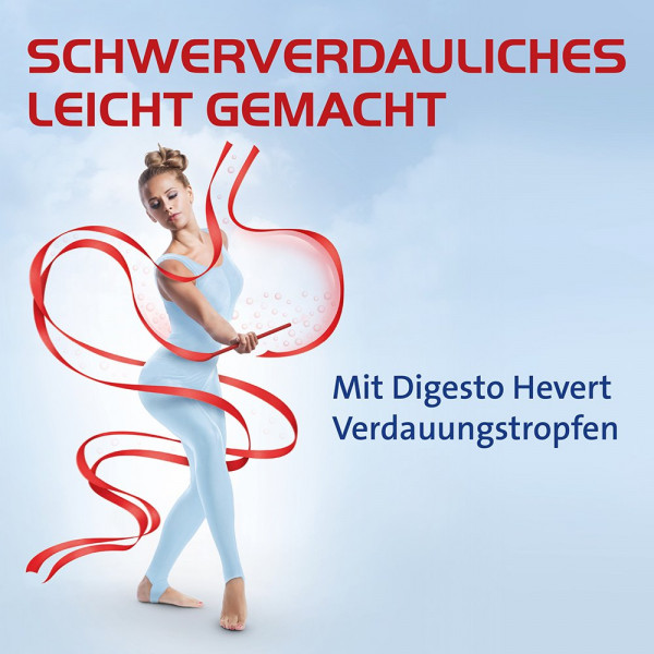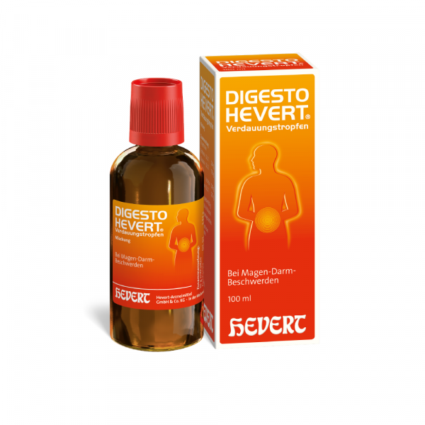 Digesto Hevert Verdauungstropfen regeln das Zusammenspiel von Magen, Darm, Leber und Galle und stärken die Verdauungsfunktion der Bauchspeicheldrüse. Die Neigung zu Blähungen (Meteorismus, Flatulenz) wird reduziert. Durch Aktivierung des Stoffwechsels wird die Nahrung besser verwertet und die Verdauung, insbesondere die Fettverdauung, angeregt. Das pflanzliche Arzneimittel reguliert außerdem das Darmmilieu, so dass sich die für die Darmflora wichtigen und guten Darmbakterien wieder besser ansiedeln können. Digesto Hevert Verdauungstropfen können im Akutfall eingesetzt werden, wenn die Magen-Darm-Beschwerden nur gelegentlich, etwa beim Genuss bestimmter Speisen, auftreten. Aber auch bei chronischen Störungen des Verdauungssystems ist eine längerfristige Einnahme von Digesto Hevert Verdauungstropfen möglich.