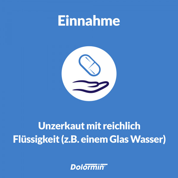Nehmen Sie Dolormin® Schmerztabletten unzerkaut und mit reichlich Flüssigkeit ein. Leiden Sie unter einem empfindlichen Magen, empfiehlt es sich die Dolormin® Schmerztablette zu einer Mahlzeit einzunehmen.