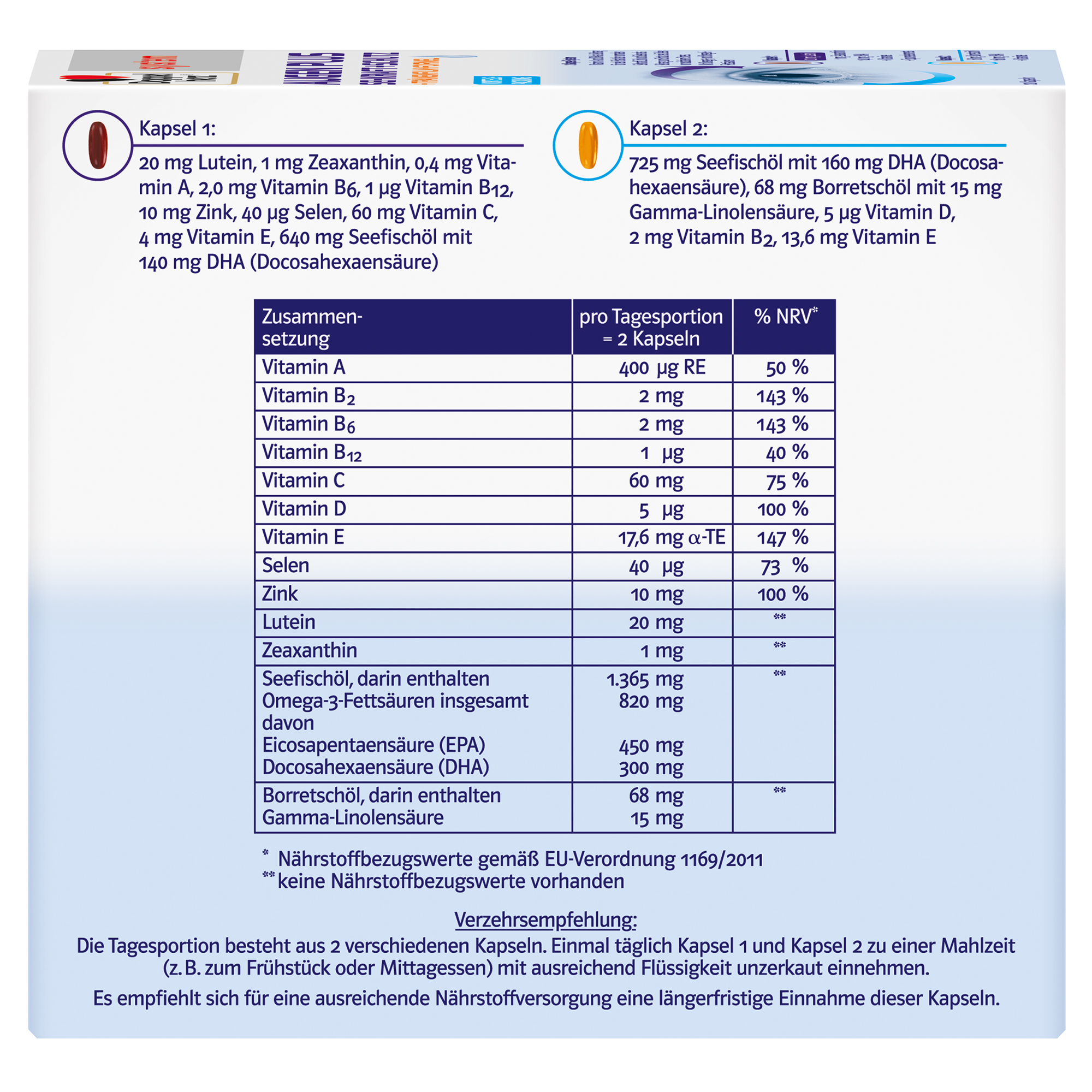 • Mit 820 mg Omega-3 Fettsäuren (davon 300 mg DHA und 450 mg EPA) und 400 µg Vitamin A pro Tagesportion (2 Kapseln) als Beitrag für den Erhalt der normalen Sehkraft