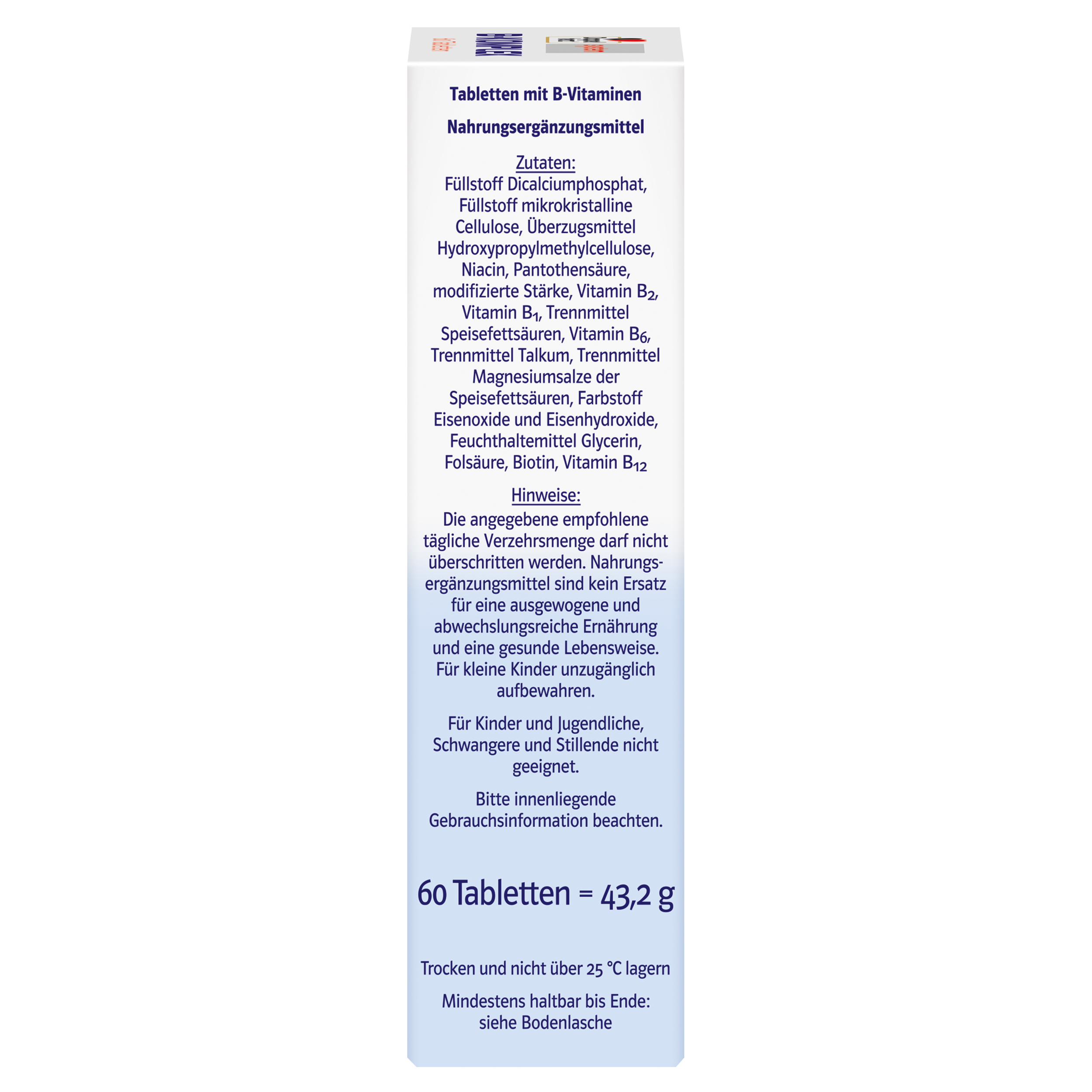 Füllstoff Dicalciumphoshat, Füllstoff mikrokristalline Cellulose, Überzugsmittel Hydroxypropylmethylcellulose, Nicotinamid, Calcium-D-pantothenat, modifizierte Stärke, Riboflavin, Thiaminmononitrat, Pyridoxinhydrochlorid, Trennmittel Speisefettsäuren, Trennmittel Talkum, Trennmittel Magnesiumsalze der Speisefettsäuren, Farbstoff Eisenoxide und Eisenhydroxide, Feuchthaltemittel Glycerin, Pteroylmonoglutaminsäure, D-Biotin, Cyanocobalamin