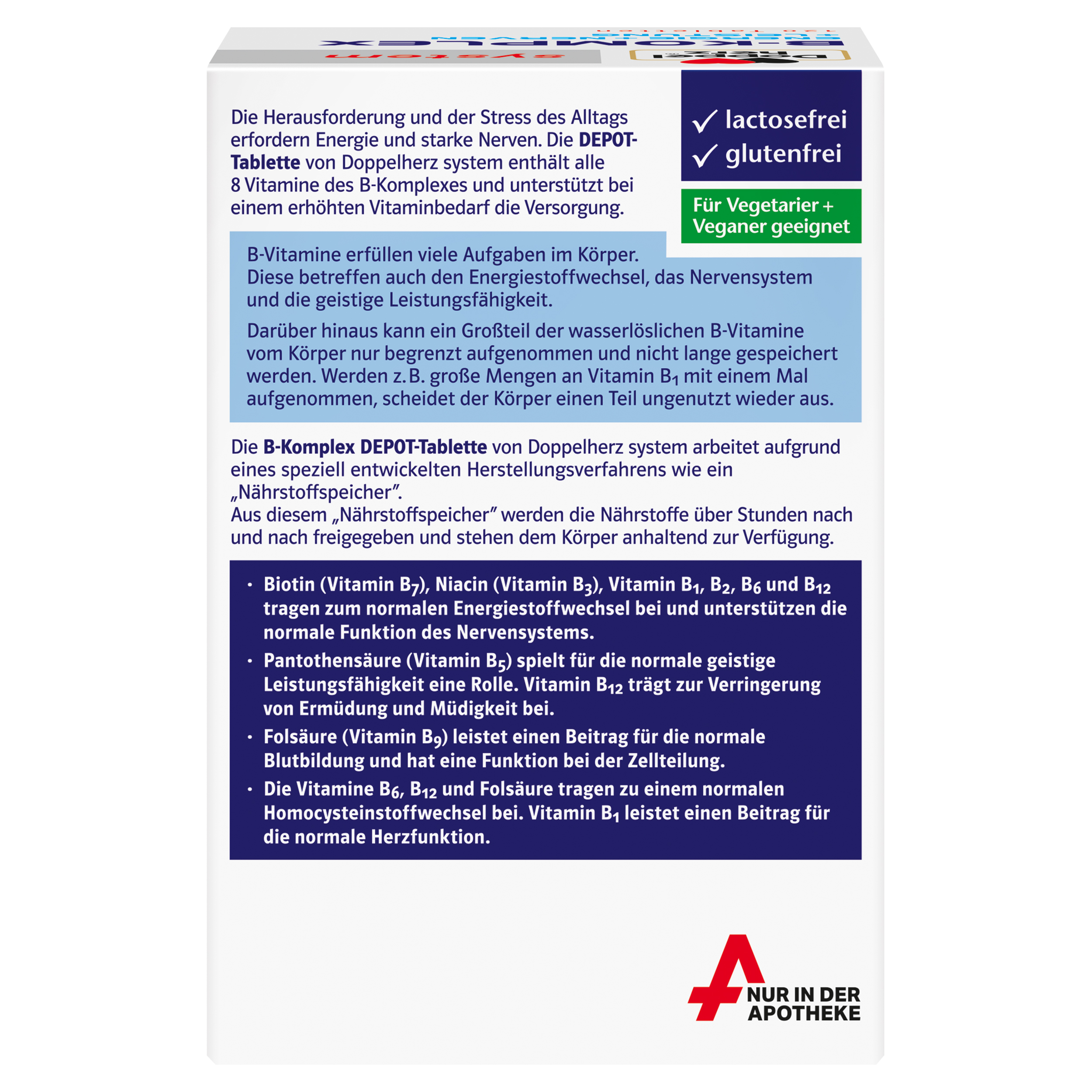 • Hochdosierte Kombination aller acht B-Vitamine. DEPOT-Tabletten für die Versorgung über viele Stunden