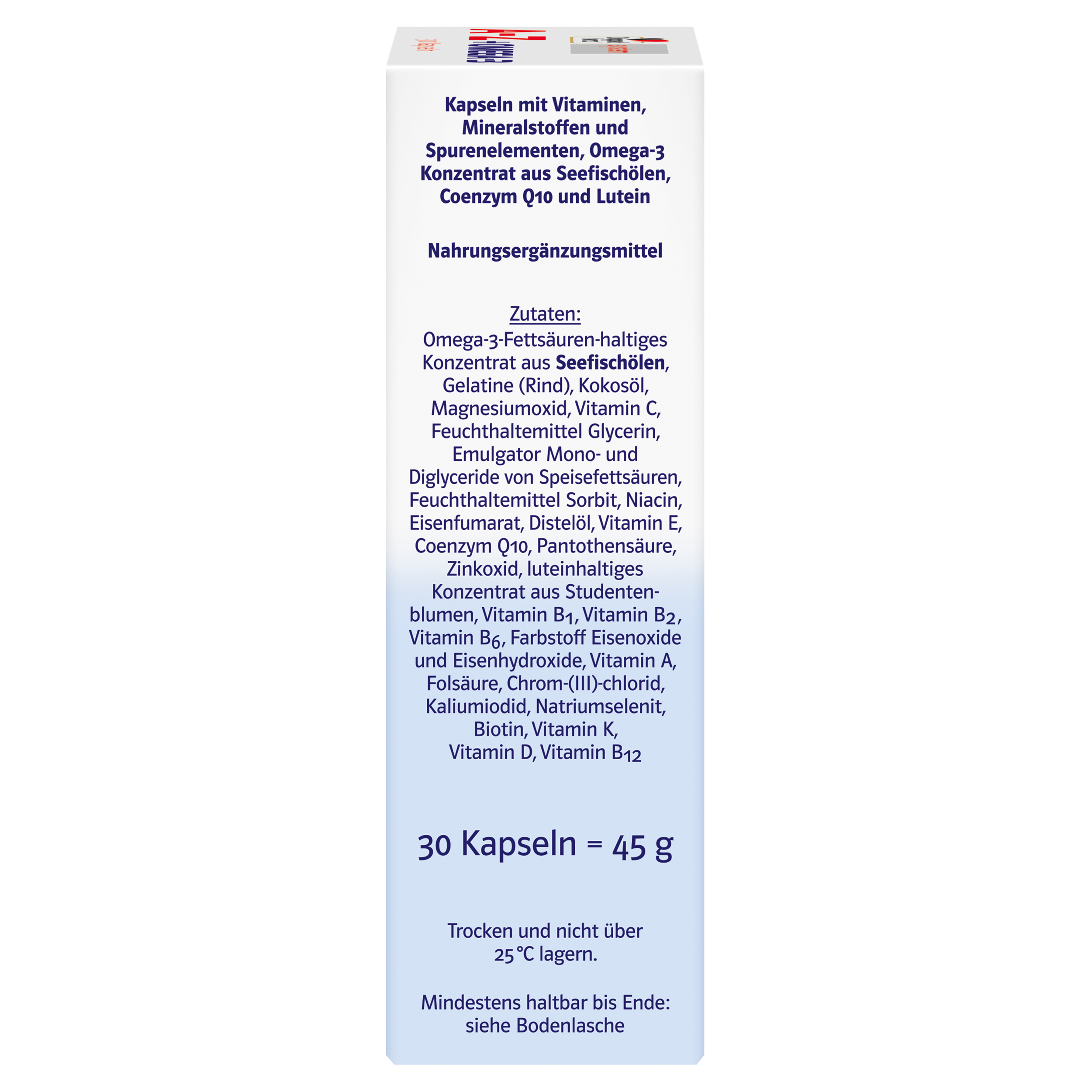 Omega-3-Fettsäuren-haltiges Konzentrat aus SEEFISCHÖLEN, Gelatine (Rind), Kokosöl, Magnesiumoxid, Vitamin C, Feuchthaltemittel Glycerin, Emulgator Mono- und Diglyceride von Speisefettsäuren, Feuchthaltemittel Sorbit, Niacin, Eisenfumarat, Distelöl, Vitamin E, Coenzym Q10, Pantothensäure, Zinkoxid, luteinhaltiges Konzentrat aus Studentenblumen, Vitamin B1, Vitamin B2, Vitamin B6, Farbstoff Eisenoxide und Eisenhydroxide, Vitamin A, Folsäure, Chrom-(III)-chlorid, Kaliumiodid, Natriumselenit, Biotin, Vitamin K, Vitamin D, Vitamin B12