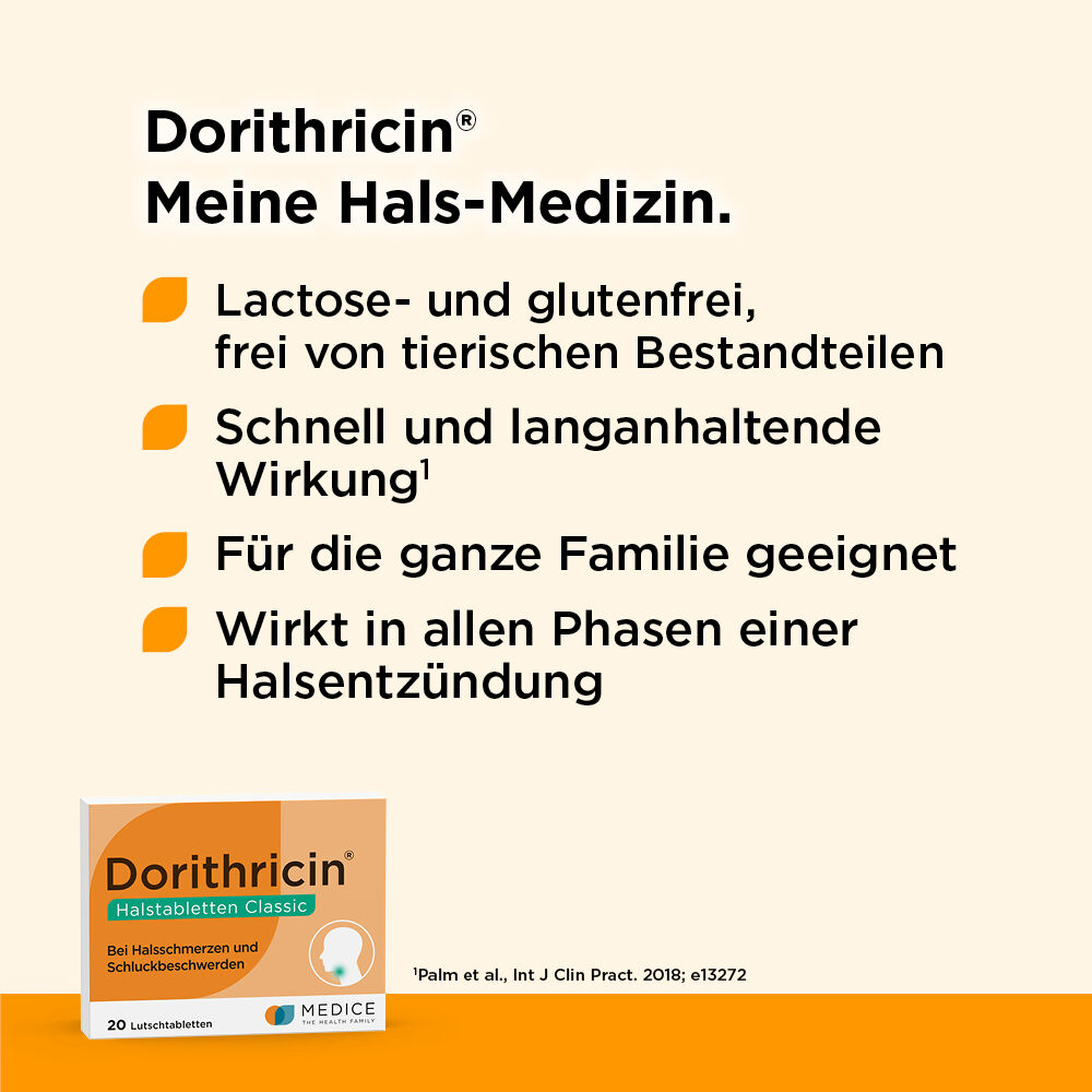 Zur Behandlung von Halsschmerzen und Schluckbeschwerden hat sich Dorithricin® seit Jahrzehnten ausgezeichnet bewährt. Es hilft schnell und effektiv zugleich. Mit der einzigartigen Wirkstoff-Formel lindert Dorithricin® nicht nur schnell den Schmerz, sondern bekämpft auch gezielt Bakterien und Viren (Schmidbauer, M., 2015: Dorithricin® wirkt antiviral (in vitro). Pharm. Ztg., 160. Jahrgang, 38. Ausg.: Seite 48–52) und bremst den Infekt, bevor die Halsschmerzen schlimmer werden.