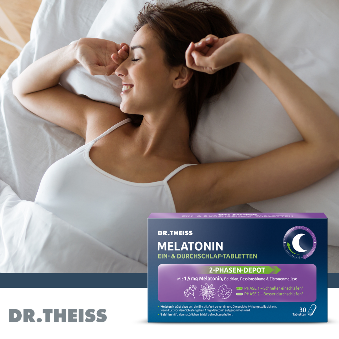 Vertrauen Sie bei Schlafproblemen auf DR. THEISS – Die meistverkauften Melatonin-Produkte in der deutschen Apotheke*. DR. THEISS Melatonin Ein- & Durchschlaf-Tabletten sind ein Nahrungsergänzungsmittel mit Melatonin und Extrakten aus Baldrianwurzel, Passionsblume und Zitronenmelisse. Melatonin ist ein natürlich vorkommendes Hormon, das von der Zirbeldrüse in unserem Gehirn produziert wird. Es spielt eine wichtige Rolle bei der Regulation unseres Schlaf-Wach-Zyklus. Melatonin wird oft als Einschlafhilfe verwendet, um Menschen dabei zu helfen, besser einzuschlafen und durchzuschlafen. Stressige Lebensphasen, Schicht- und Nachtarbeit oder lange Flugreisen über mehrere Zeitzonen hinweg, können zu Schlafproblemen führen. Für viele Menschen, die unter Schlafstörungen leiden, kann Melatonin eine effektive Lösung sein. Schlafstörungen können verschiedene Formen annehmen, wie zum Beispiel Schwierigkeiten beim Einschlafen, häufiges Aufwachen während der Nacht oder das Gefühl von nicht erholsamem Schlaf. In solchen Fällen kann die Einnahme von Melatonin z. B. in Form von Ein- & Durchschlaf-Tabletten helfen, den Schlaf-Wach-Rhythmus zu regulieren und die Schlafqualität zu verbessern. Erholsamer Schlaf ist wichtig, um die körperliche und geistige Gesundheit sowie Leistungsfähigkeit zu erhalten. Während des Schlafs erholt sich unser Körper von den Aktivitäten des Tages und bereitet sich auf den nächsten Tag vor. Stressige Lebensphasen, Schicht- und Nachtarbeit können zu Einschlafproblemen führen. DR. THEISS Melatonin Ein- & Durchschlaf-Tabletten mit einem innovativen 2-Phasen-Freisetzungsprozess: 1. Phase (schneller einschlafen): 1 mg Melatonin* trägt dazu bei die Einschlafzeit zu verkürzen. Passionsblume und Zitronenmelisse können den Schlaf unterstützen und für Entspannung sorgen. 2. Phase (besser durchschlafen**): 0,5 mg Melatonin und Baldrianwurzel-Extrakt** werden zeitversetzt abgegeben. Baldrian unterstützt das Durchschlafen. • Nahrungsergänzungsmittel bei Schlafproblemen • Schneller einschlafen, besser durchschlafen • Schlaftabletten (Nahrungsergänzungsmittel) mit 2-Phasen-Freisetzungsprozess • Unterstützung des natürlichen Schlafzyklus • Mit Melatonin, Passionsblumen- und Baldrianextrakt und Zitronenmelisse. • Laktosefrei, zuckerarm und alkoholfrei • Vegan *Melatonin trägt dazu bei, die Einschlafzeit zu verkürzen. Die positive Wirkung stellt sich ein, wenn kurz vor dem Schlafengehen 1 mg Melatonin aufgenommen wird. **Baldrian hilft, den natürlichen Schlaf aufrechtzuerhalten.