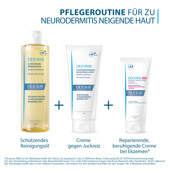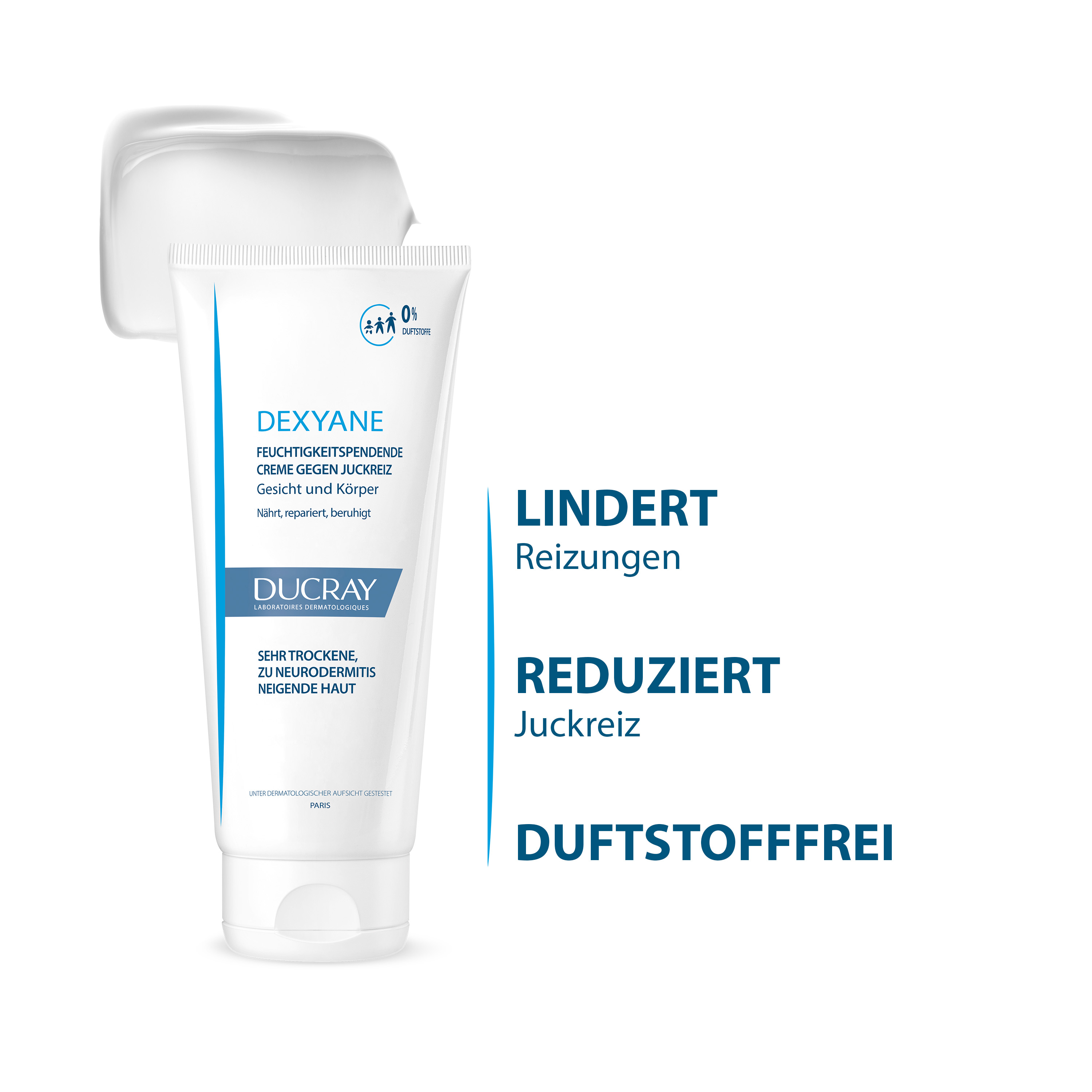 Eine sehr trockene, zu Neurodermitis neigende Haut fühlt sich oft sehr unangenehm an. Grund dafür ist eine beschädigte Hautbarriere, was zu vermehrtem Spannungsgefühl und teilweise starkem Juckreiz führen kann. DEXYANE Anti-Juckreiz Creme pflegt, repariert und beruhigt sehr trockene, zu Neurodermitis neigende Haut, indem er ihr mehr Komfort bietet.