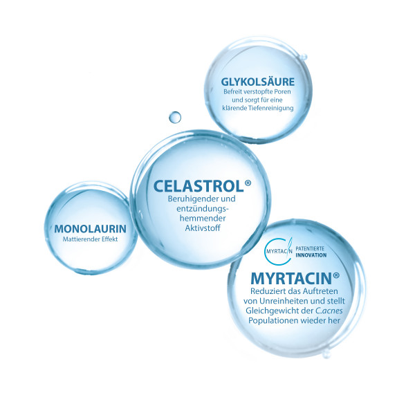 Die Keracnyl Glycolic+ Anti-Mitesser Creme mit Anti-Glanz-Effekt glättet das Hautbild bei anfänglicher bzw. Retentionsakne.