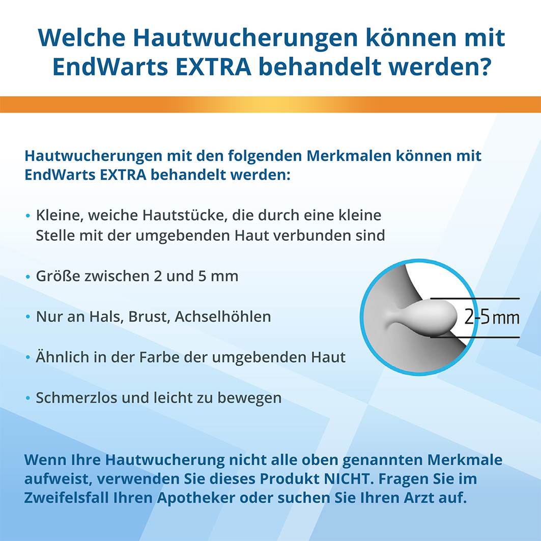 Wenn Ihre Hautwucherung nicht alle oben genannten Eigenschaften aufweist oder wenn Sie Zweifel haben, wenden Sie dieses Produkt nicht an. Fragen Sie Ihren Arzt, bevor Sie EndWarts Extra gegen Stielwarzen anwenden.