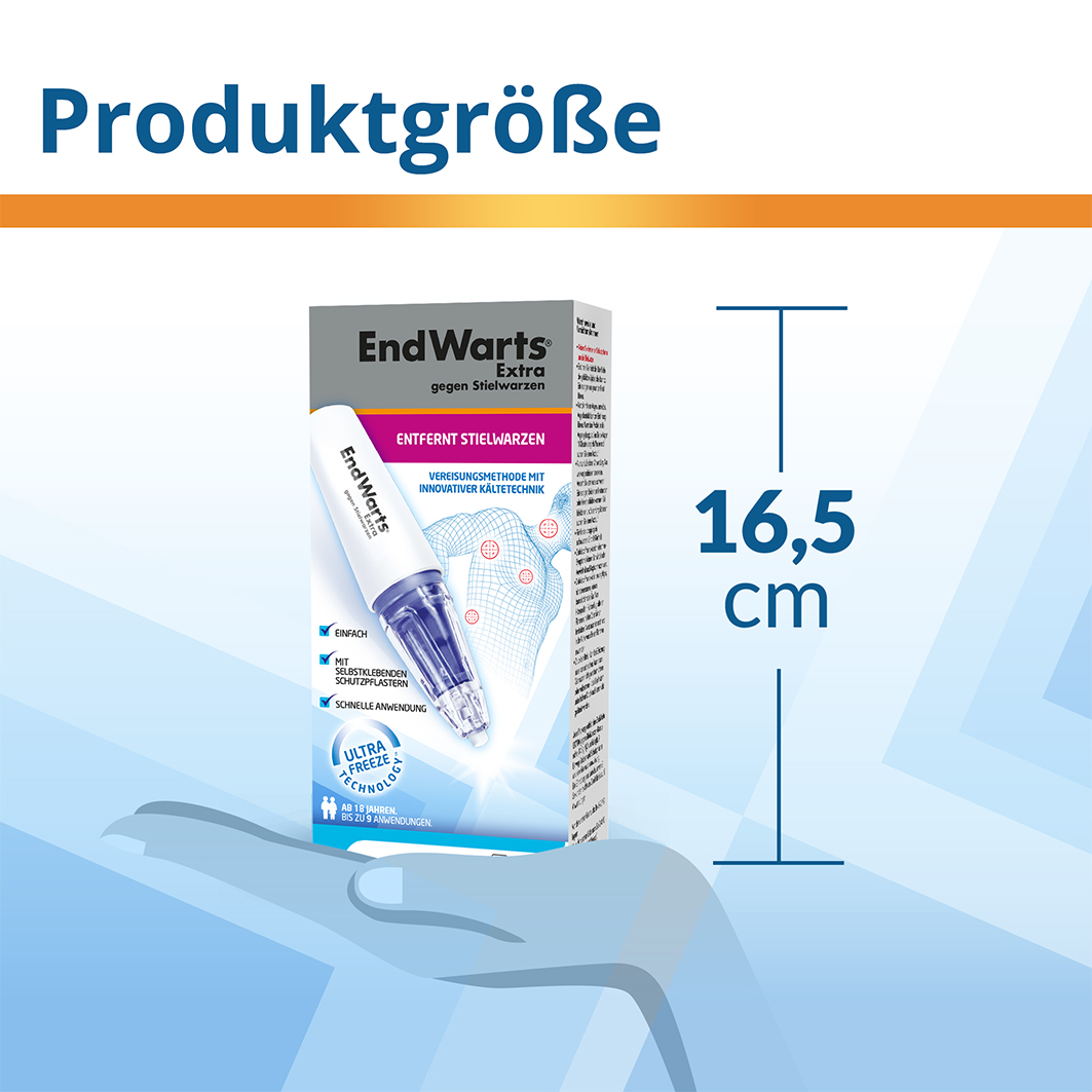 - Jede Packung enthält eine EndWarts Extra gegen Stielwarzen Kartusche (14,3 g N2O verflüssigt), 9 EinwegSpitzen und Schutzpflaster und eine Gebrauchsanweisung.