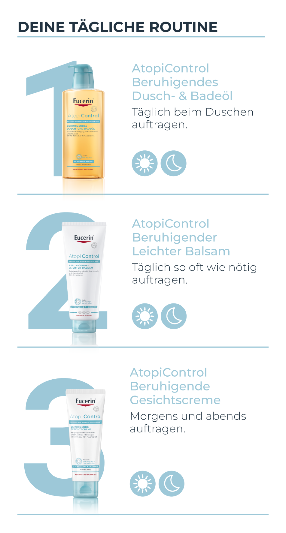 - Eucerin AtopiControl Dusch- und Badeöl auf die nasse Haut auftragen