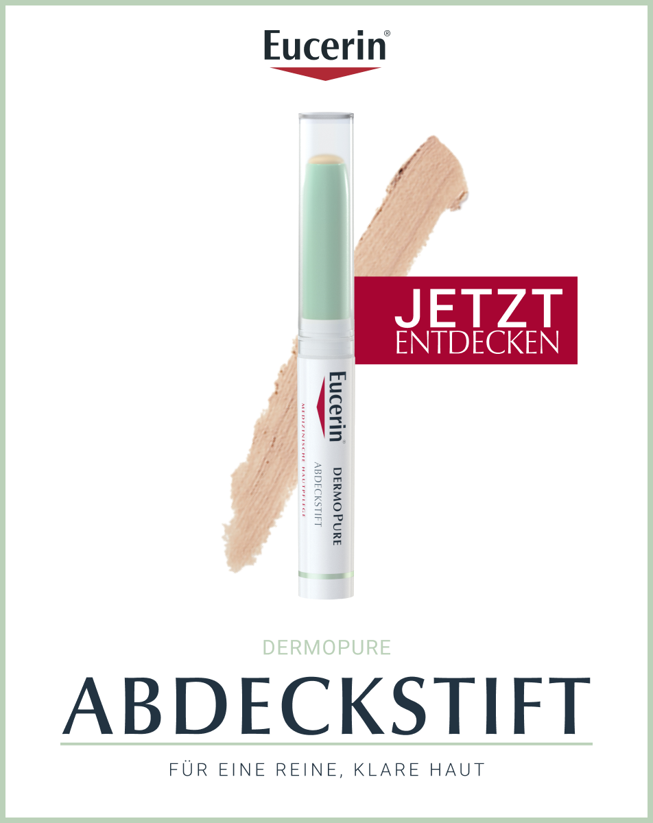 Der Eucerin DermoPure Abdeckstift wirkt auf zweifache Weise: zum einen werden Hautunreinheiten sichtbar und sofort abgedeckt, zum anderen werden nachweislich Pickel reduziert. Der Stift enthält dazu den Wirkstoff Salicylsäure und diese wirkt komedolytisch – das bedeutet, dass Mitesser bei täglicher Anwendung aufgelöst werden.