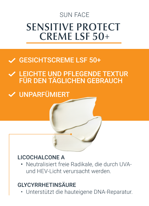 Die Eucerin Sensitive Protect Face Sun Creme LSF 50+ kombiniert effektiven Schutz vor Sonnenstrahlung mit schonender Feuchtigkeitspflege für empfindliche Haut. Der hochwirksame Breitband-UVA/UVB-Filter der Sonnencreme schützt zusammen mit dem HEV-Licht-Schutz Licochalcone A vor Hautschäden durch Sonnenstrahlen, während mit Glycyrrhetinsäure der natürliche Heilungsprozess der DNA unterstützt wird. Die Tagespflege mit Sonnenschutz hat eine leichte, cremige Textur, die schnell einzieht und nicht fettet und ist auch für Patienten mit Neurodermitis oder besonders empfindlicher Haut verträglich. Die Gesichtscreme pflegt und mattiert die Haut und ist für den täglichen Gebrauch geeignet.
