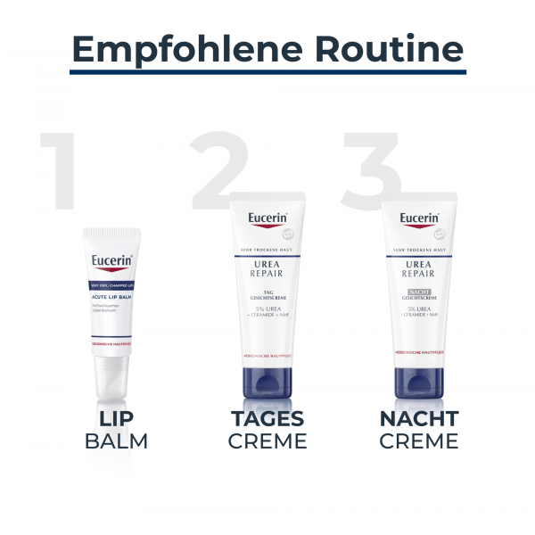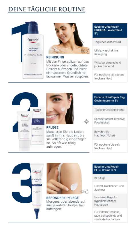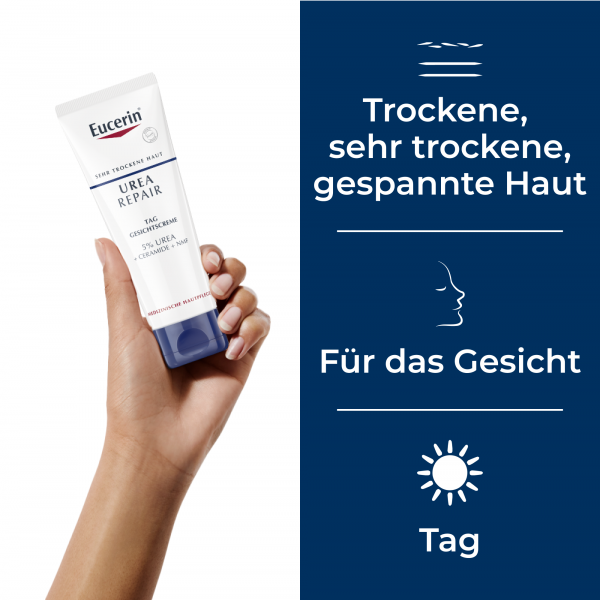Die Urea Repair Tag Gesichtscreme 5% pflegt trockene bis sehr trockene Gesichtshaut jeden Morgen intensiv und lindert Spannungsgefühle. Die Feuchtigkeitspflege zieht schnell ein und hinterlässt die Haut spürbar glatter und geschmeidiger. Zudem ist die Hautcreme als Basis für Make-up sowie bei Schuppenflechte (Psoriasis) und Altershaut geeignet.