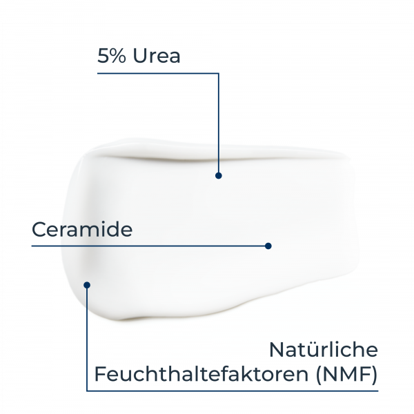 Die Hautpflege ist mit Urea und Lactat, zwei natürlichen sowie feuchtigkeitsbindenden Präparaten, angereichert. Dies sorgt für eine schnelle und langanhaltende Versorgung mit Feuchtigkeit und raue Haut wird damit glatter. Auch nach der Rasur, bei zu Schuppung neigender Haut und bei Juckreiz bietet die Creme eine wirksame Pflege.