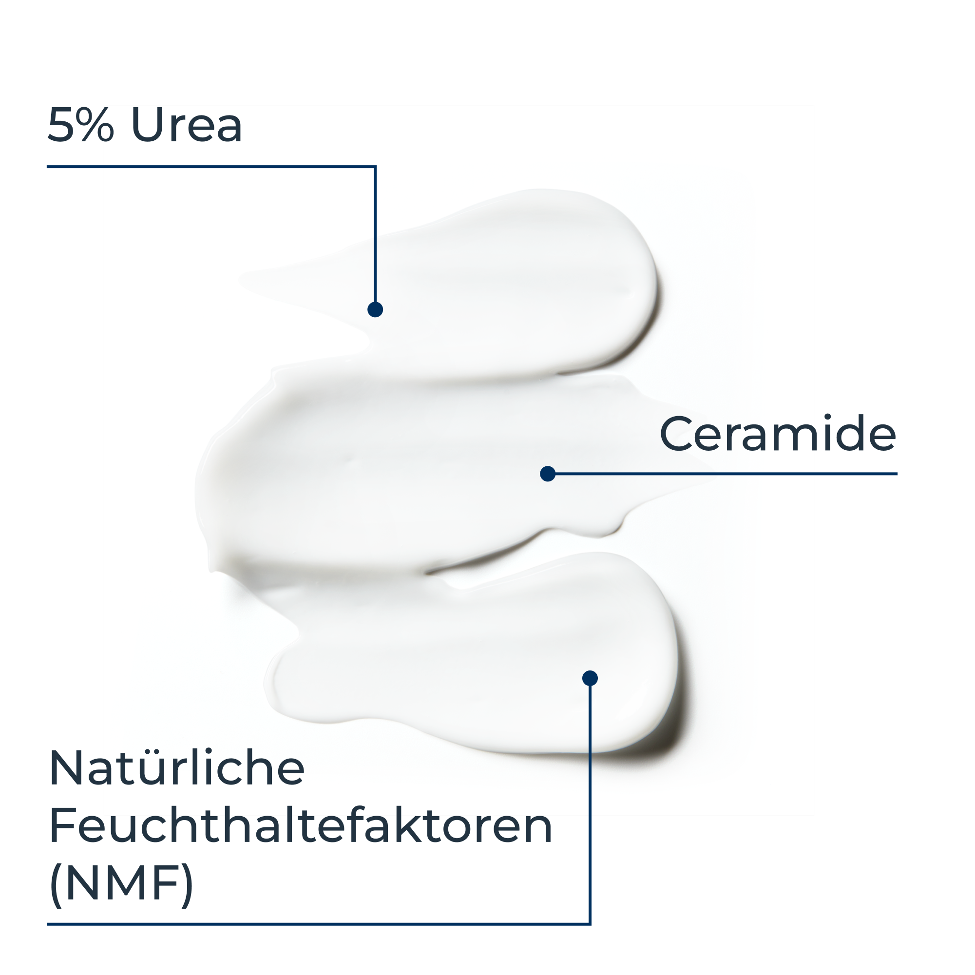 Der Repair-PLUS-Komplex in der Körpercreme verbessert die Feuchtigkeitsbindung der Haut und so wird der Feuchtigkeitsgehalt in den oberen Hautschichten deutlich erhöht. Dies wird durch die Kombination des Wirkstoffs Urea mit natürlichen Feuchthaltefaktoren erreicht. Zugleich stärken Ceramide die hauteigene Barriere, schützen und pflegen intensiv. Spannungsgefühl, Juckreiz oder eine raue Oberfläche werden sofort gelindert. Dafür bleibt ein glattes und geschmeidiges Hautgefühl.