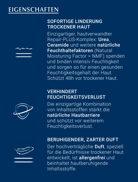 Die Hautcreme enthält den Repair-PLUS-Komplex, der den Wirkstoff Urea mit natürlichen Feuchthaltefaktoren kombiniert. Auf diese Weise wird die Feuchtigkeitsbindung der Haut verbessert und der Feuchtigkeitsgehalt in den oberen Hautschichten deutlich erhöht. Zusätzlich schützen Ceramide die Haut, pflegen sie intensiv und stärken die hauteigene Barriere. Auf diese Weise können Spannungsgefühl, Juckreiz oder eine raue Oberfläche sofort gelindert werden und die Haut wird fühlbar glatt und geschmeidig.