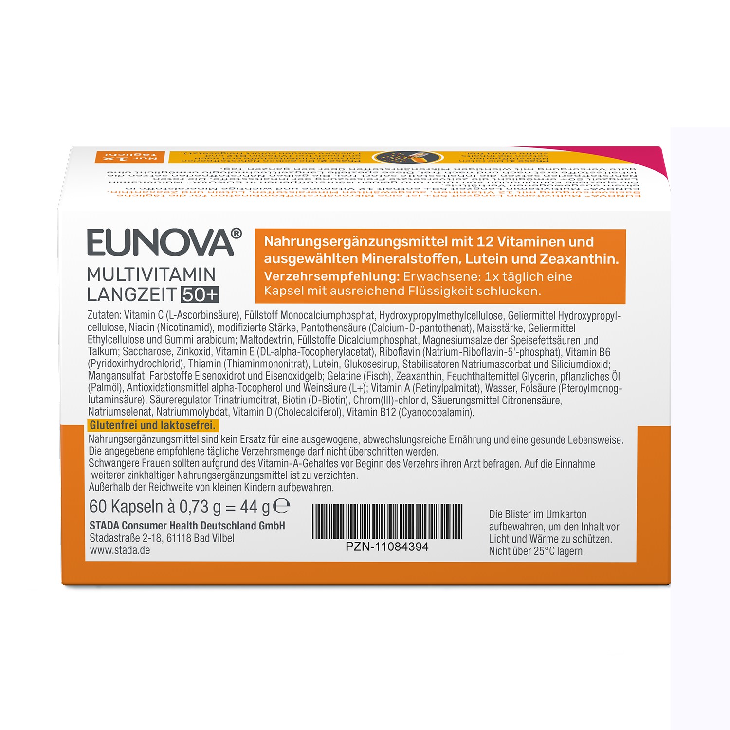die in geringeren Mengen benötigt werden. Auch Mineralstoffe müssen regelmäßig über die Ernährung aufgenommen werden, weshalb eine ausgewogene und abwechslungsreiche Ernährung sowie eine gesunde Lebensweise wichtig sind. EUNOVA® Langzeit 50+ hilft Menschen ab einem Alter von 50 Jahren ihren täglichen Bedarf an wertvollen Nährstoffen zu decken.