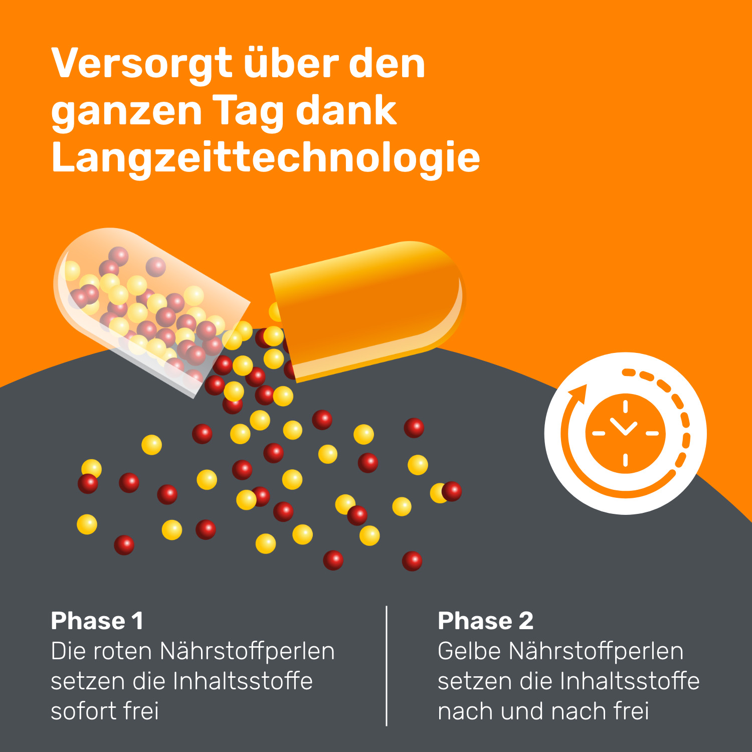 - Spezielle Langzeittechnologie ermöglicht zeitverzögerte Freisetzung der Vitamine für eine sinnvolle Versorgung über den ganzen Tag