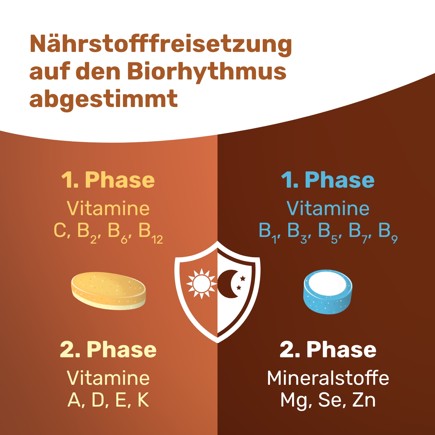 Um im anspruchsvollen Alltag fit zu sein, ist eine ausreichende Nährstoffversorgung wichtig. Nahrungsergänzungsmittel können, als Ergänzung zur täglichen Ernährung, den Körper in seiner Funktion und Leistungsfähigkeit unterstützen. Doch nicht alle Vitamine und Mineralstoffe werden zur gleichen Zeit benötigt, da sich viele körperliche Prozesse an einem 24h-Rhythmus orientieren, wie z.B. der Schlaf-Wach-Rhythmus. Die Muskelaktivität ist z.B. tagsüber höher, wohingegen bestimmte Körperprozesse nachts aktiver sind. Eine sinnvolle Nährstoffversorgung findet im Einklang mit der „inneren Uhr“ statt. EUNOVA® VivaChrono ist auf den 24h-Takt des Körpers abgestimmt – und unterstützt so mit einer speziellen Nährstoffkombination am Tag den Energiestoffwechsel und die Widerstandskraft des Körpers, in der Nacht trägt es zur Erholung und Regeneration bei.1,2,3,4,5 Durch die Kombination aus einer Tablette morgens und einer für den Abend mit durchdachten Tablettentechnologien werden die Nährstoffe bequem und clever koordiniert freigesetzt.