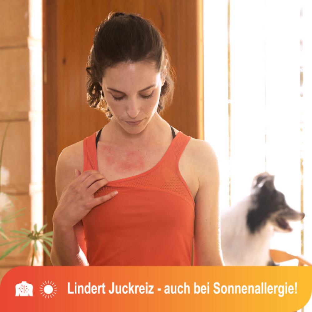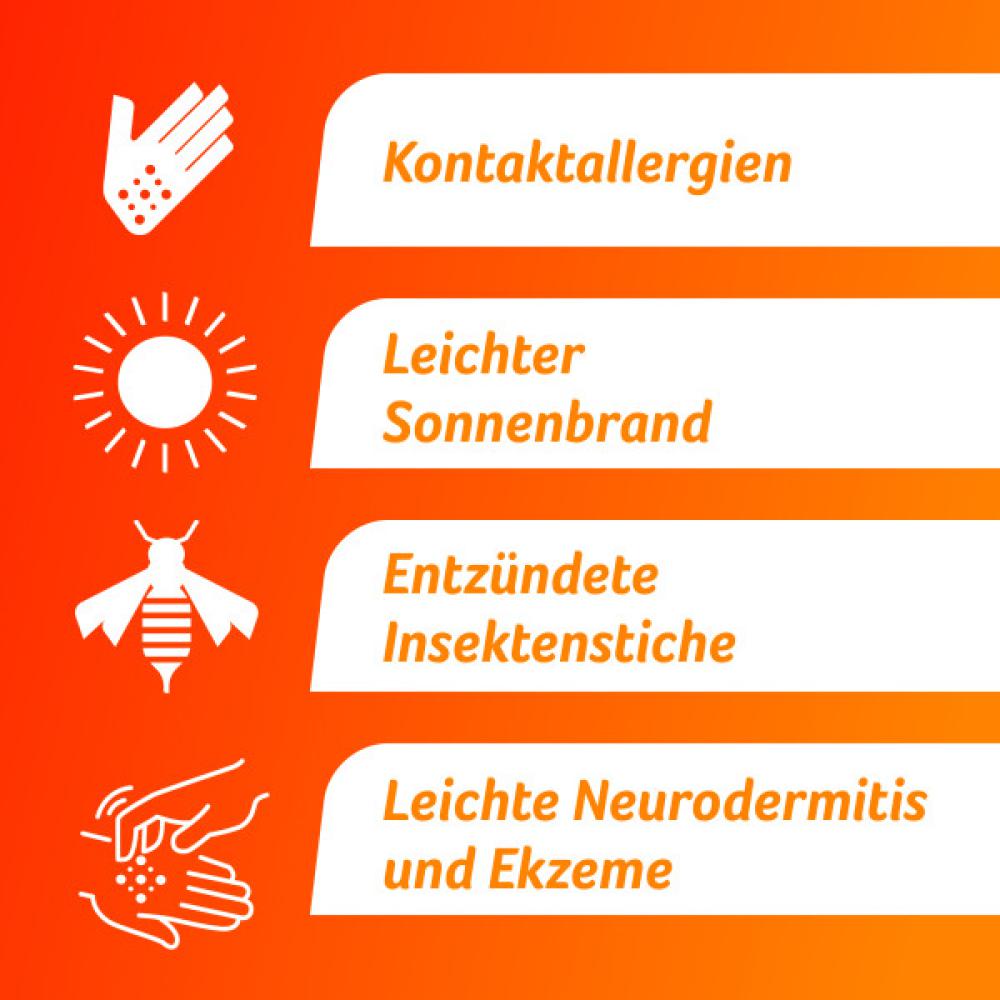 • Bekämpft die Symptome der entzündeten Haut z.B. bei Sonnenbrand (ersten Grades), Kontaktallergie, leichter Neurodermitis, Ekzemen, Sonnenallergie oder entzündeten Insektenstichen