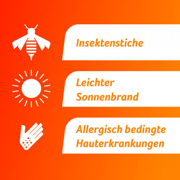 • Lindert Juckreiz und Schmerzen bei Hauterkrankungen, Insektenstichen, Sonnenbrand.