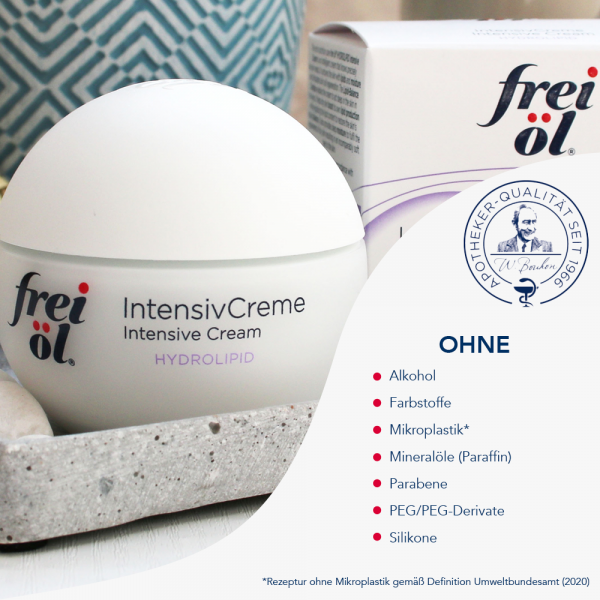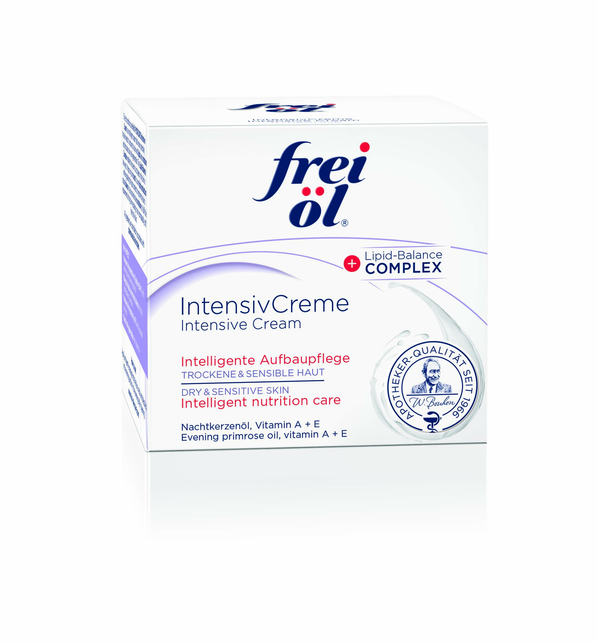 Die reichhaltige Aufbaupflege frei öl® HYDROLIPID IntensivCreme ist eine intelligente Creme, die erkennt, was die Haut braucht. Sie versorgt die Haut mit Lipiden und Feuchtigkeit und unterstützt ihre Zellerneuerung. Mit dem Lipid- Balance-Komplex wirkt sie tief in der Haut auf zweifache Weise: Sie regt trockene Haut an, die eigene Lipid-Produktion zu erhöhen und gleichzeitig reguliert sie den Lipidgehalt so, dass das Gleichgewicht wieder hergestellt wird. Zusätzlich spendet sie Feuchtigkeit und erfüllt somit die Bedürfnisse der trockenen Haut. Das Ergebnis ist ein unvergleichliches Hautgefühl. Alle Inhaltsstoffe werden nach pharmazeutischen Prinzipien kontrolliert.