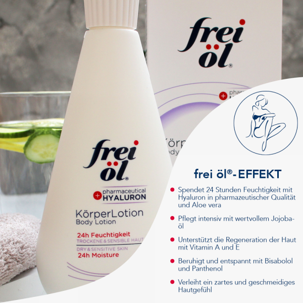 Die leichte KörperLotion hüllt Ihre Haut in pures Wohlgefühl. Das Hyaluron in reiner pharmazeutischer Qualität und Aloe vera dringen intensiv in die Haut ein und versorgen sie für 24 Stunden mit viel Feuchtigkeit. Natürliches Jojobaöl sorgt für zarte Pflege, Vitamin A und E unterstützen die Regeneration, während Panthenol und Bisabolol die Haut zusätzlich beruhigen. Der Unterschied ist sofort spürbar – die KörperLotion zieht schnell ein und fettet nicht. Die Haut fühlt sich geschmeidig an und sieht gepflegt aus. Ideal für trockene und sensible Haut. frei öl® KörperLotion – Tag für Tag sanfte Pflege für ein spürbar entspanntes Hautgefühl.