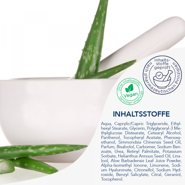 - Spendet 24 Stunden Feuchtigkeit mit Hyaluron in pharmazeutischer Qualität und Aloe vera