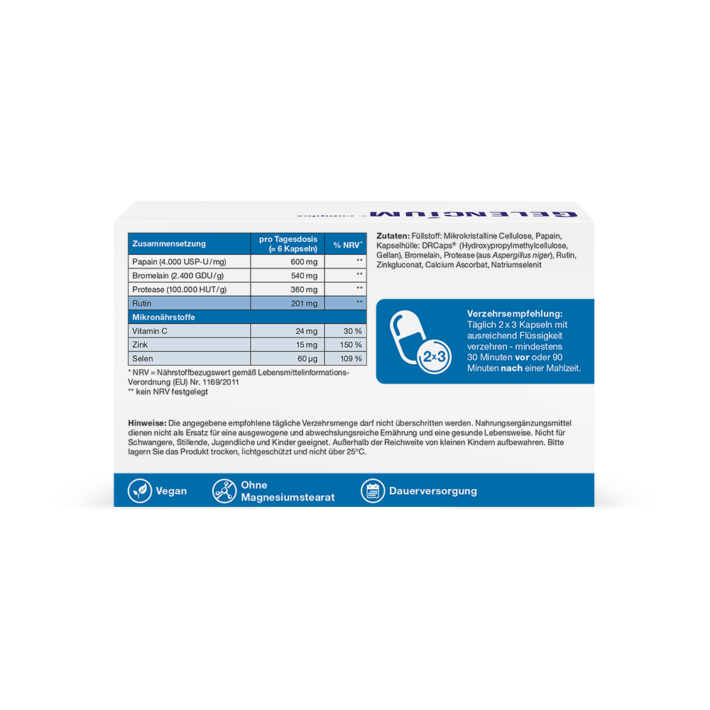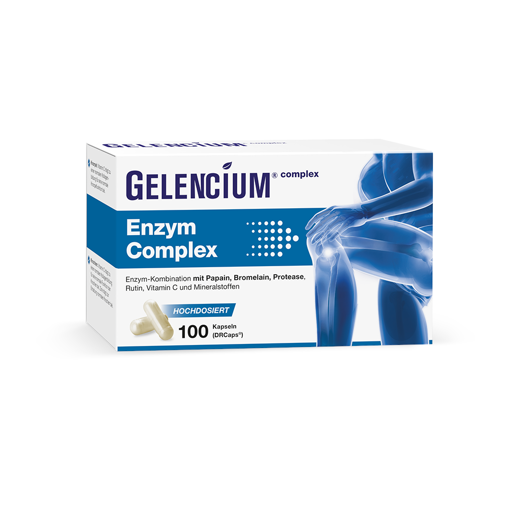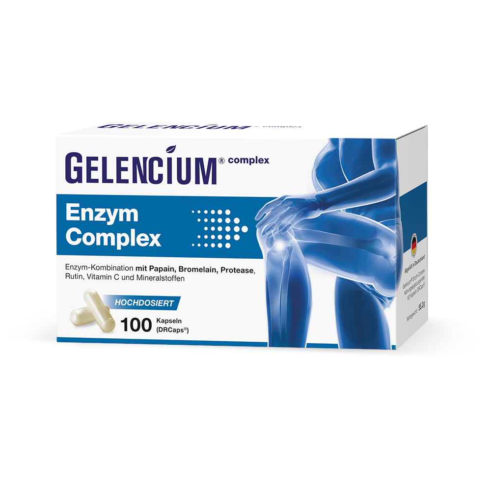 GELENCIUM® Enzym Complex ist ein modernes, hochdosiertes Enzympräparat der führenden Arthrose-Apothekenmarke GELENCIUM®. Dieses kombiniert drei wertvolle Enzyme (Bromelain, Papain, Protease) mit antioxidativem Rutin und essenziellen Mikronährstoffen für die Gelenkgesundheit. Dabei überzeugt die 3-fach Enzym-Kombination im Wettbewerbsvergleich mit einer überdurchschnittlich hohen Tagesdosis von 1.500 mg. Zur Enzym-Aktivierung ist der Pflanzenstoff Rutin enthalten. Für eine optimale Bioverfügbarkeit sorgen die magensaftresistenten DRCaps®. Sie verzögern die Freisetzung der Enzyme, wodurch die enzymatische Aktivität vollständig erhalten bleibt.