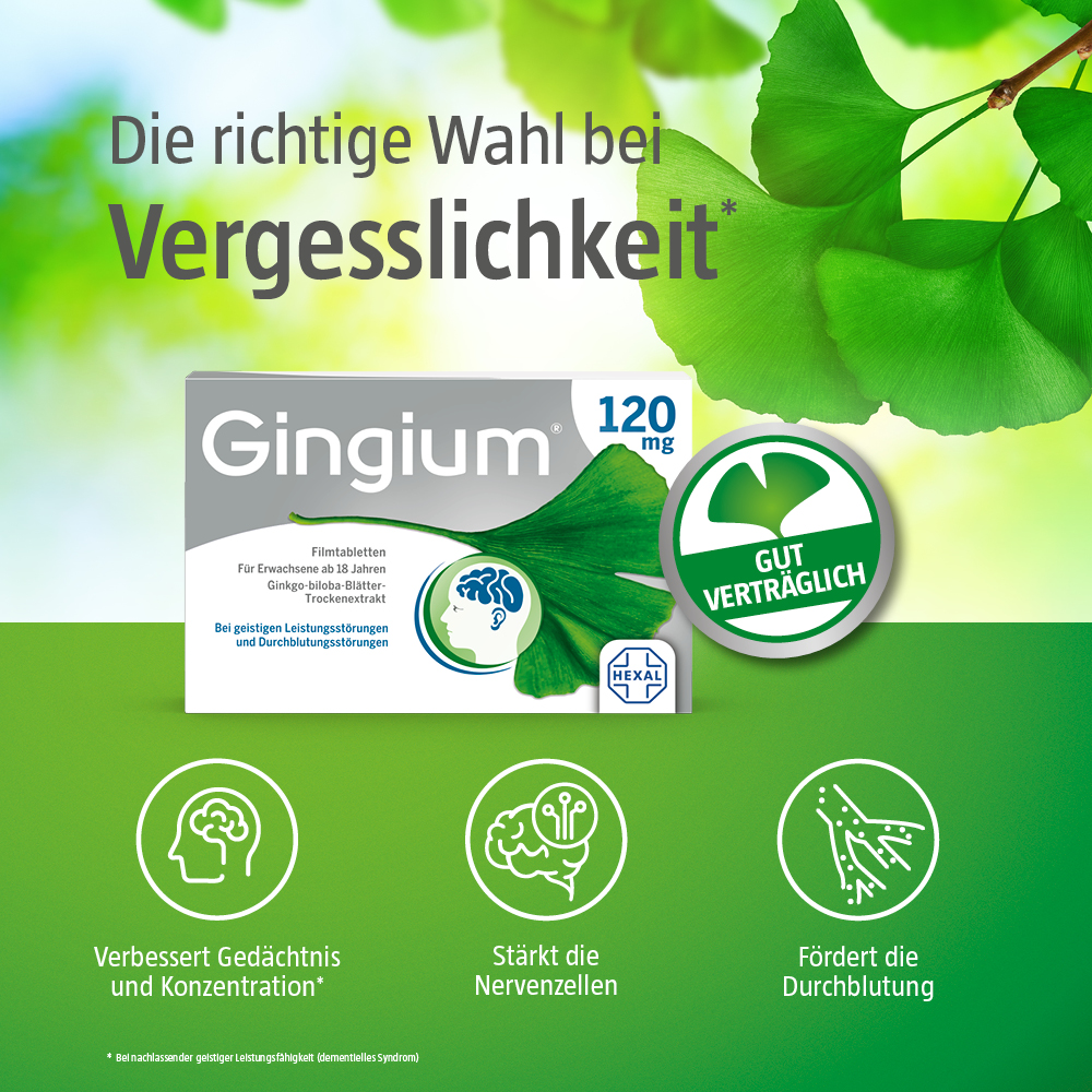 Damit das Gehirn seinen vielfältigen Aufgaben gut nachkommen kann, braucht es ausreichend Nährstoffe und Sauerstoff. Gingium® 120 mg hilft dabei, indem es die Durchblutung im Gehirn fördert und dadurch Gedächtnis und Konzentration verbessert.* Zudem unterstützt Gingium® 120 mg durch die bessere Durchblutung auch die Regeneration des Innenohrs bei Tinnitus**. Der hochwertige Spezialextrakt wird aus den Blättern des Ginkgo-Baumes gewonnen, weist eine hohe Konzen- tration natürlicher Wirkstoffe (Ginkgoflavonglykoside, Terpenlactone) auf und ist gut verträglich.