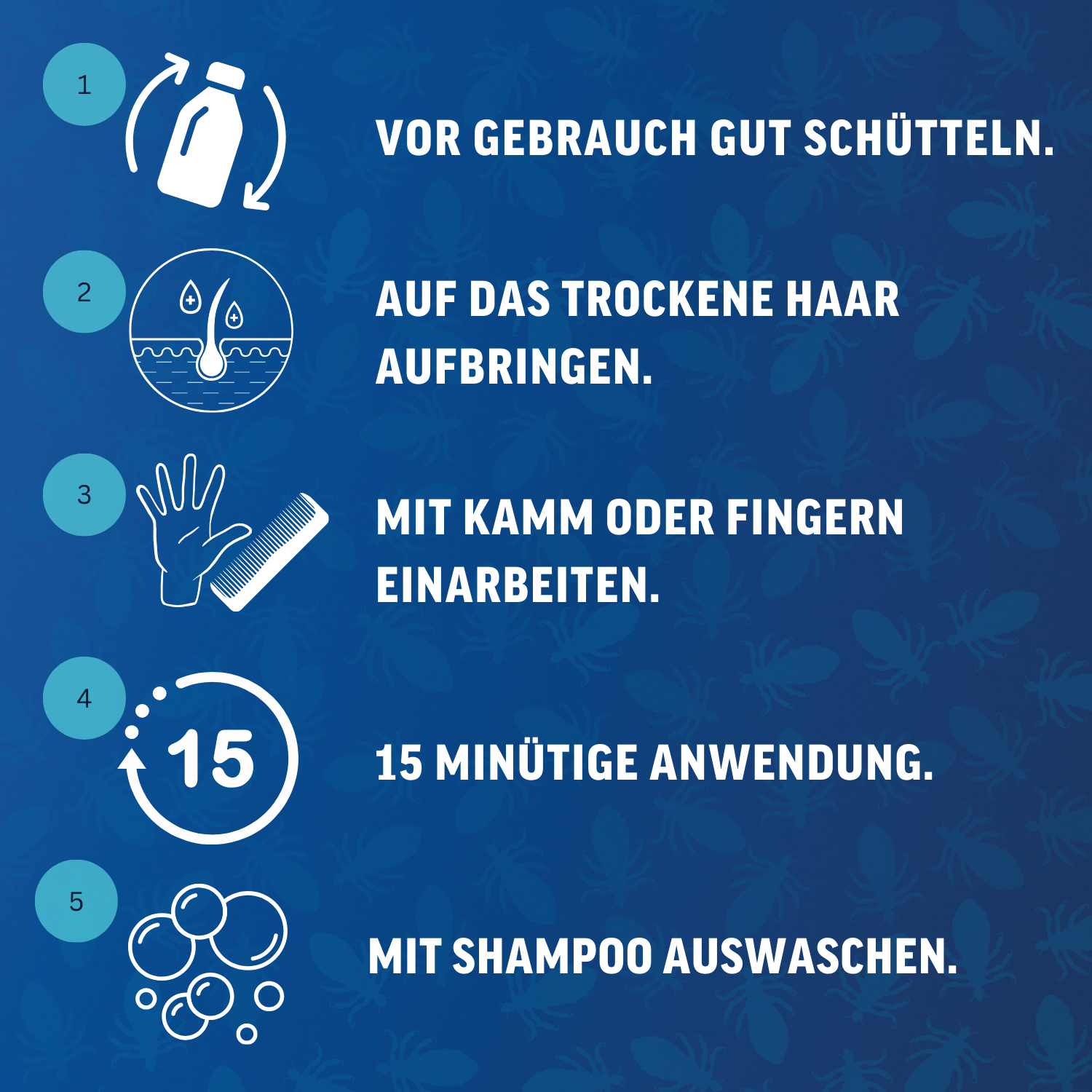 Anwendung: Tragen Sie das Präparat auf das trockene Haar auf. Nach 15-minütiger Einwirkzeit verwenden Sie eine Pflegespülung und kämmen die Haare sorgfältig mit einem Läusekamm aus. Nach rund einer Woche sollte eine Nachuntersuchung erfolgen, um sicherzustellen, dass keine Läuse oder Eier übersehen wurden. Es ist geeignet für Erwachsene und Kinder ab 6 Monaten.