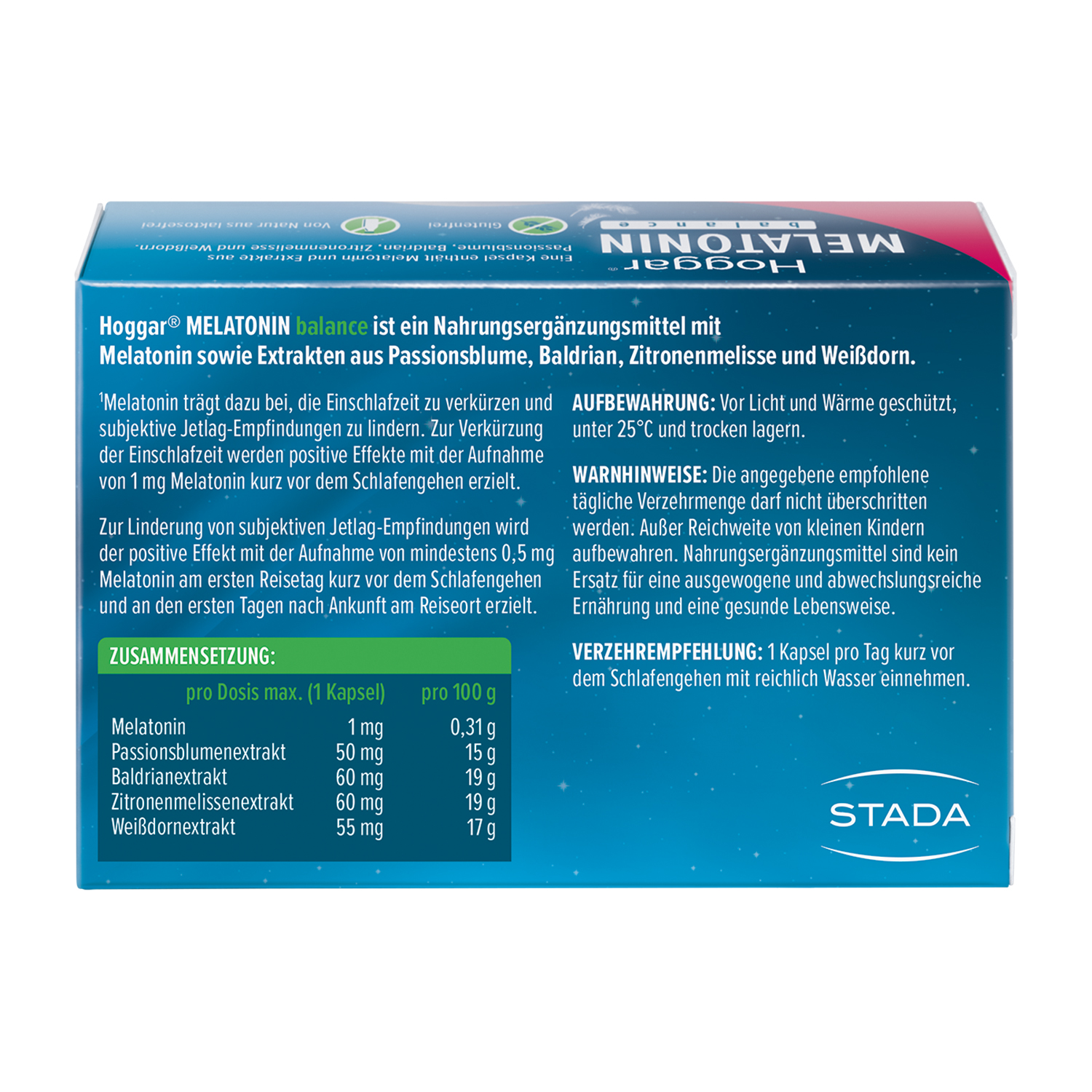 Stärkenatriumoctenylsuccinat, Trennmittel Siliciumdioxid und Magnesiumsalze der Speisefettsäuren, Melatonin