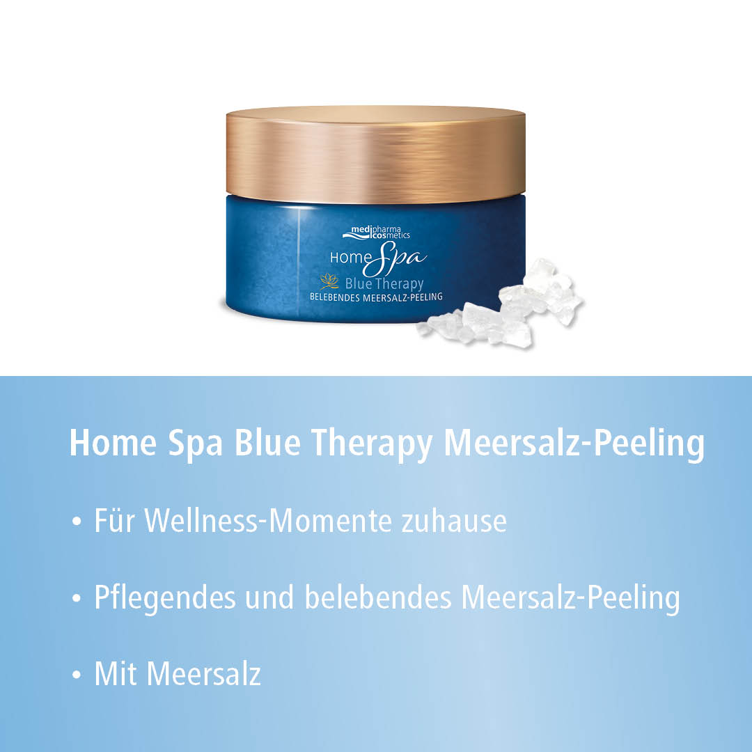 Das Home Spa Körperpeeling Blue Therapy von medipharma cosmetics reinigt sanft Ihre Haut und hinterlässt ein samtig-weiches Hautgefühl. Meersalz löst verhornte Hautzellen während die pflegenden Öle die Haut vor dem Austrocknen schützen. Der frische Geruch des Meersalzes lädt zum Entspannen ein.