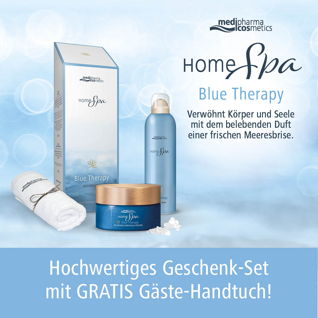 Schenken Sie Ihren Liebsten eine Auszeit! Home Spa Blue Therapy ist eine Wellness-Produktserie mit Meeresmineralien-Extrakt, die mit einem erfrischenden Duft die Sinne verwöhnt. Die Blue Therapy-Serie im Set mit einem gratis Gästehandtuch eignet sich ideal als Geschenk zu Weihnachten, Geburtstage, Muttertag oder einfach so!