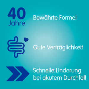 Symptomatische Behandlung akuter Durchfälle für Erwachsene und Jugendliche ab 12 Jahren, sofern keine ursächliche Therapie zur Verfügung steht. Eine über 2 Tage hinausgehende Behandlung nur unter ärztlicher Verordnung u. Verlaufsbeobachtung.