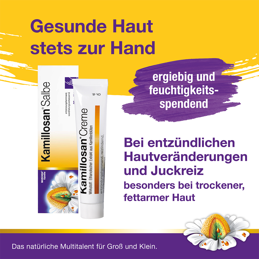 Kamillosan Creme. Auszug aus Kamillenblüten (Matricaria recutita L.) (2,7-5,5:1) 20 mg. Anwendungsgebiet: Kamillosan Creme wird angewendet zur Nachbehandlung im Anschluss an eine lokale Kortikoidtherapie entzündlicher Hauterkrankungen, u.a. verschiedener Ekzemformen wie z. B. Kontaktekzem, Gewerbeekzem, Ekzem bei Kindern, Neurodermitis (atopisches Ekzem).